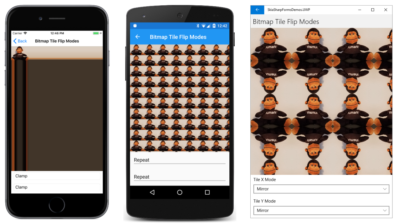 Keep in mind that you can use different options for the horizontal and vertical repetition. You can specify SKShaderTileMode.Mirror as the second argument to CreateBitmap but SKShaderTileMode.Repeat as the third argument. On each row, the monkeys still alternate between the normal image and the mirror image, but none of the monkeys are upside-down.