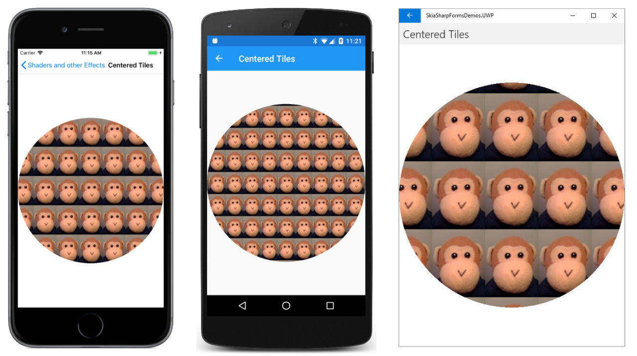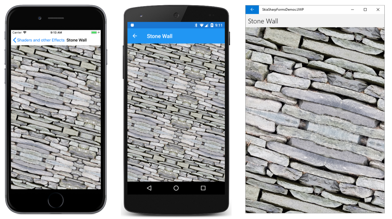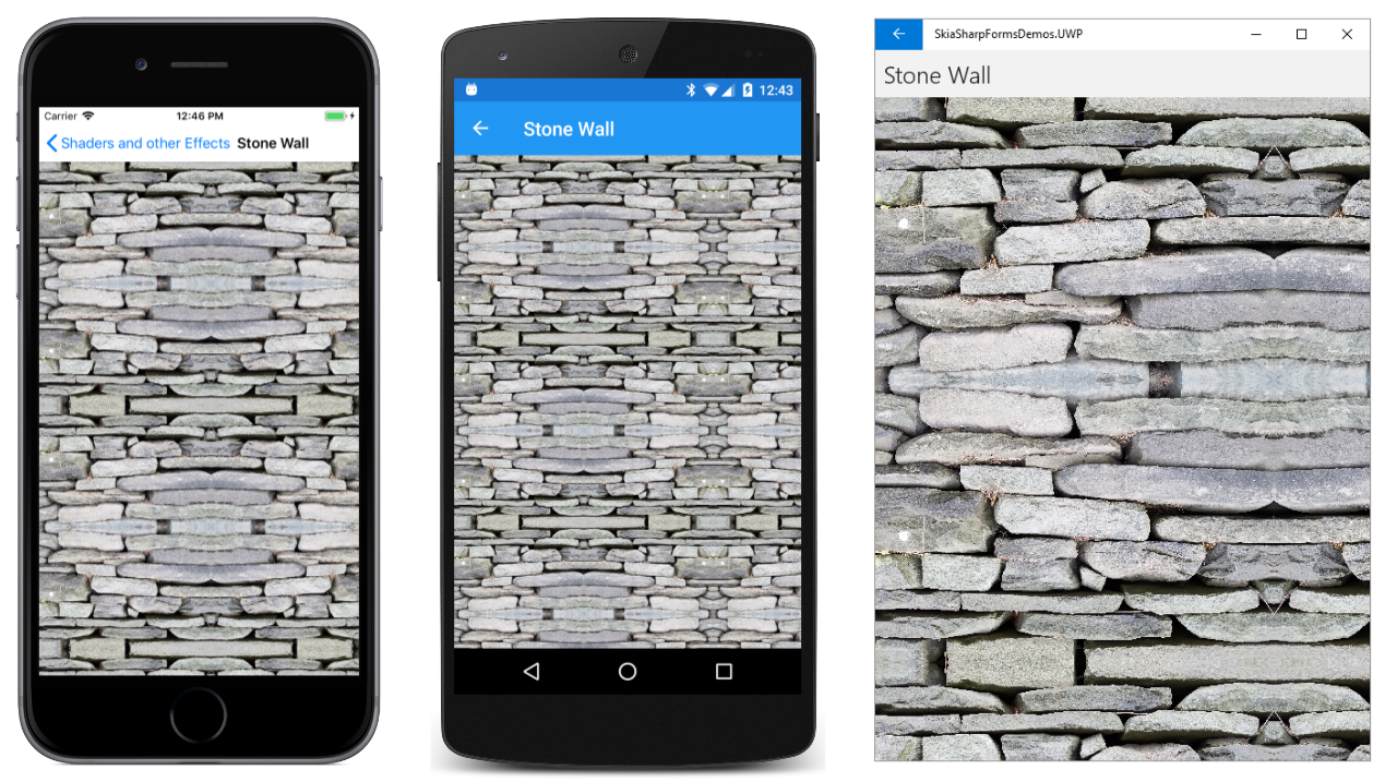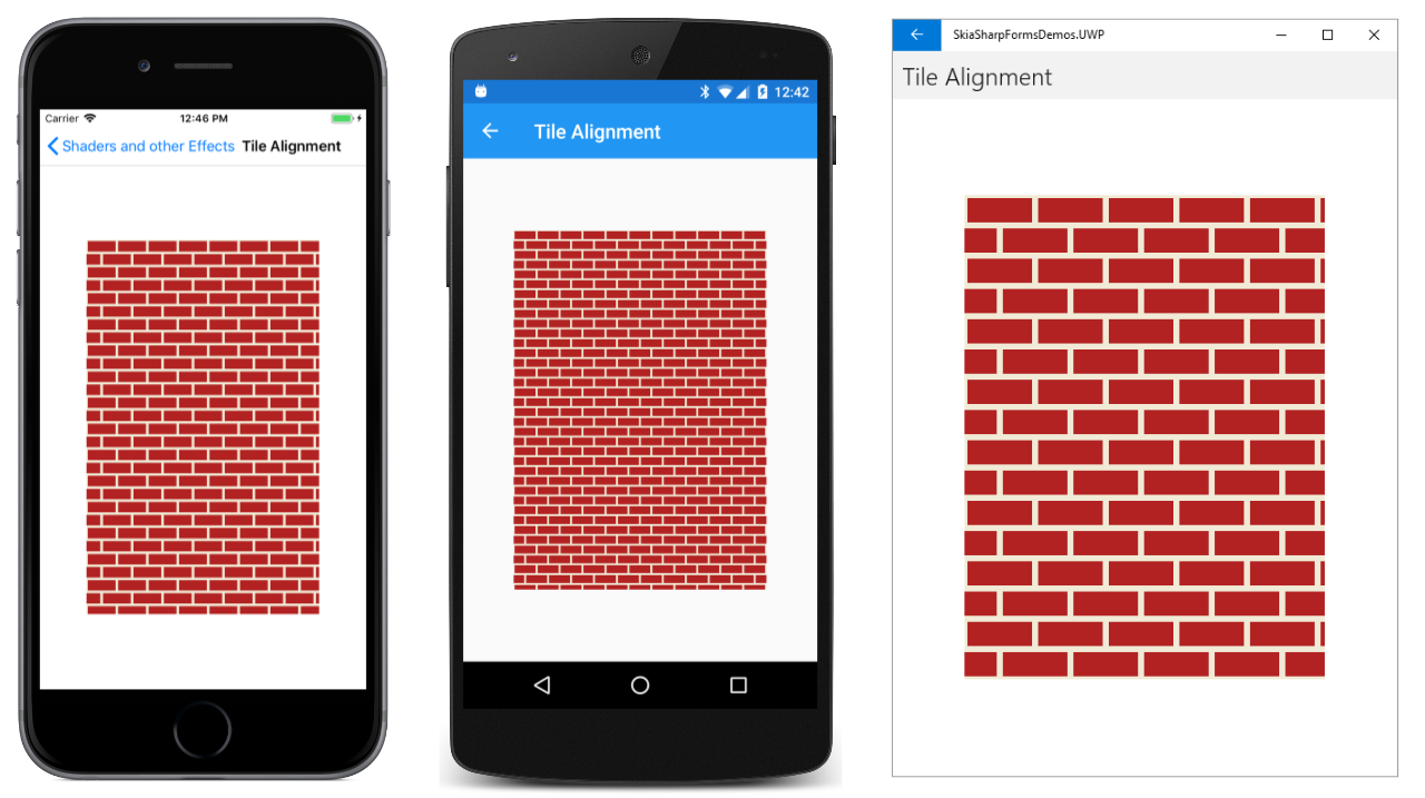 The Android screen in the center shows the result of SKShaderTileMode.Repeat for both arguments. The tile is repeated horizontally and vertically. The Universal Windows Platform screen shows SKShaderTileMode.Mirror. The tiles are repeated but alternately flipped horizontally and vertically. The advantage of this option is that there are no discontinuities between the tiles.