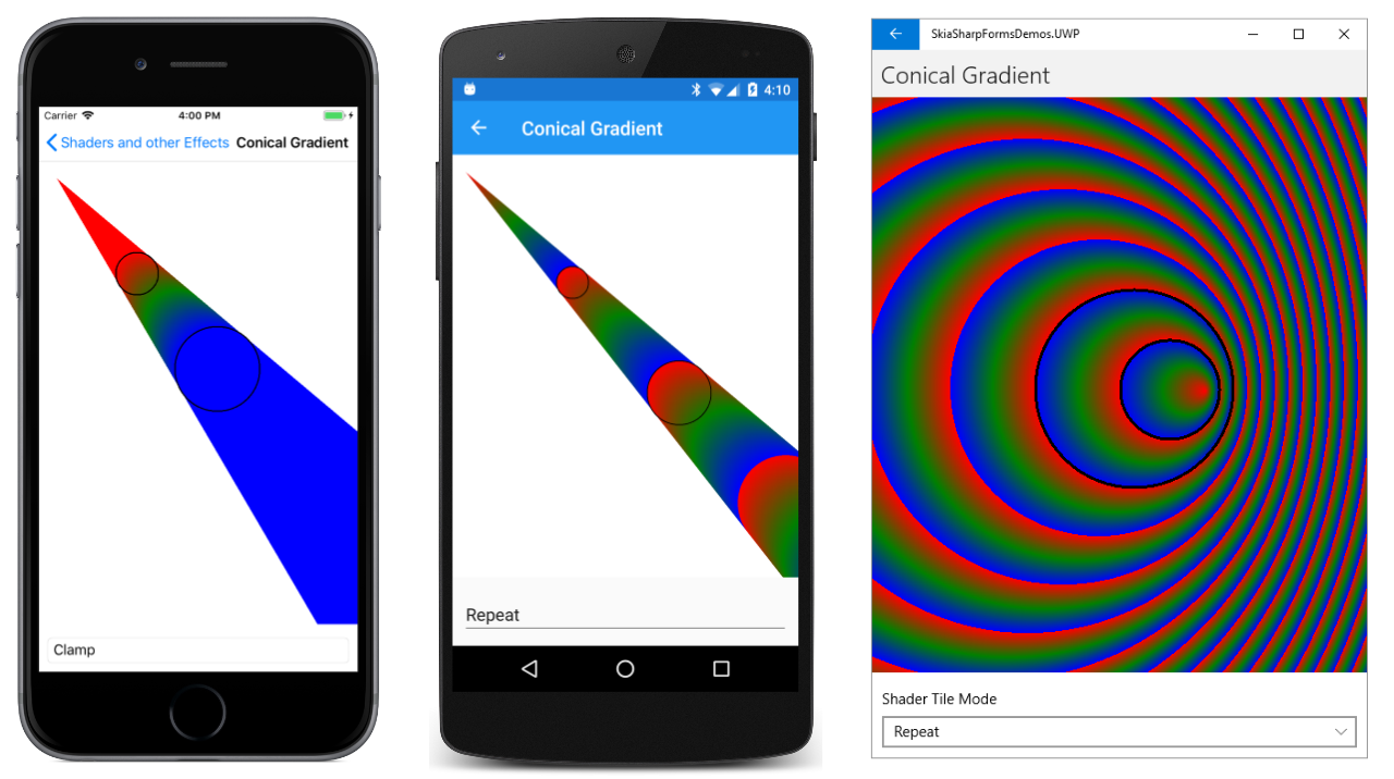 The effect of SKShaderMode is demonstrated in the Radial Gradient page in the sample. The XAML file for this page instantiates a Picker that allows you to select one of the three members of the SKShaderTileMode enumeration: