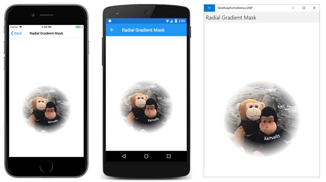 In all three cases, the gradient fills the canvas. On the iOS screen at the left, the gradient beyond the radius continues with the last color, which is white. That's the result of SKShaderTileMode.Clamp. The Android screen shows the effect of SKShaderTileMode.Repeat: At 100 pixels from the center, the gradient begins again with the first color, which is black. The gradient repeats every 100 pixels of radius.