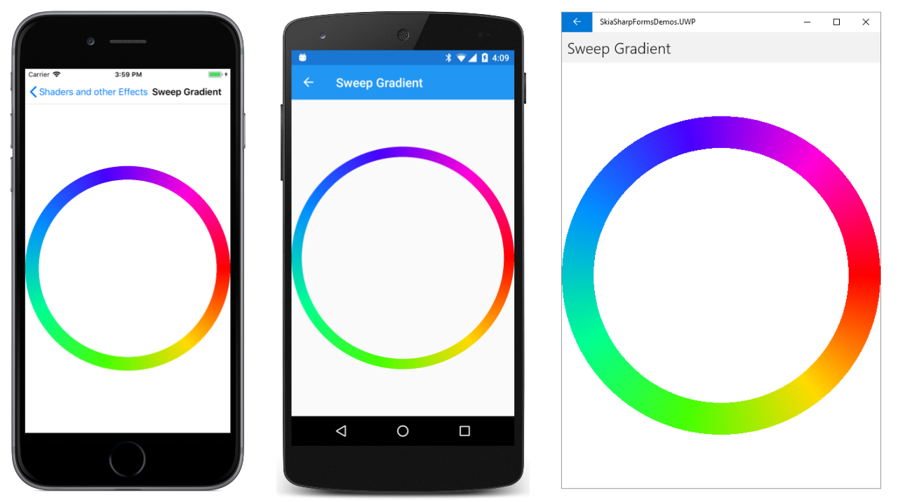 The SweepGradientPage class defines an array of eight colors with different hue values. Notice that the array begins and ends with red (a hue value of 0 or 360), which appears at the far right in the screenshots: