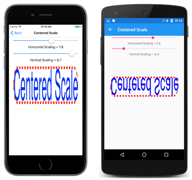 negative values of vertical scaling (such as on the Android screen in the center) cause objects to flip around the horizontal axis that passes through the center of scaling. Negative values of horizontal scaling (such as in the UWP screen on the right) cause objects to flip around the vertical axis that passes through the center of scaling.