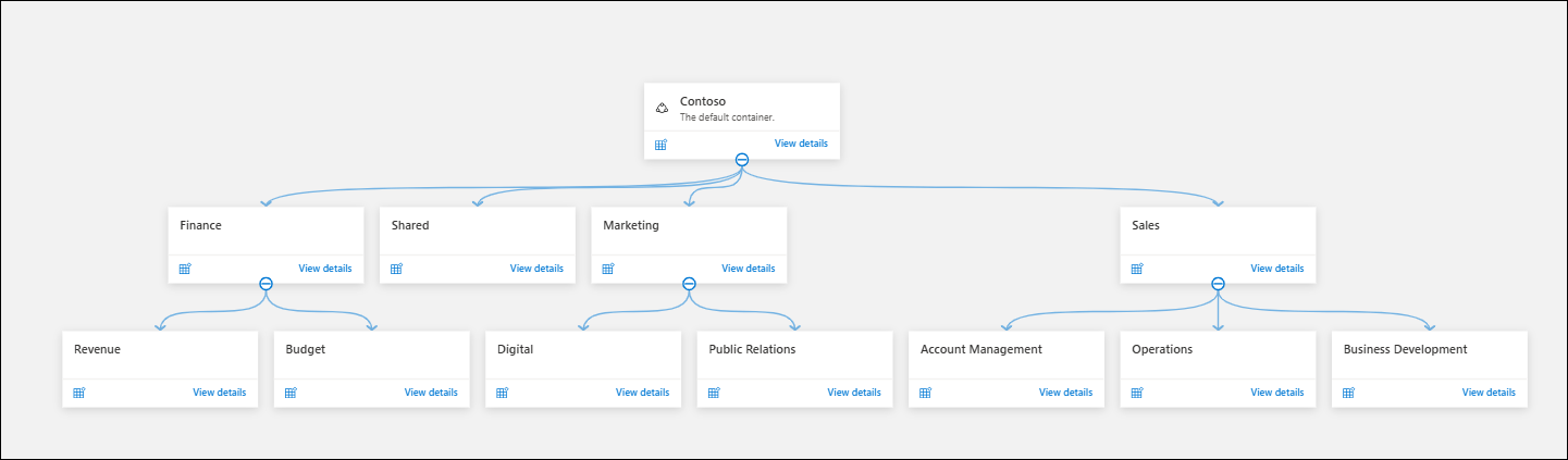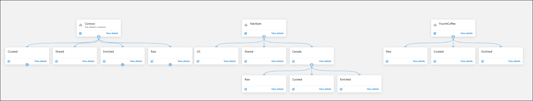 Each organization has a domain of its own with their own collections hierarchy in the Microsoft Purview account. Security resources are managed inside each domain and data sources are registered and scanned in the corresponding domains. Assets are added to the subcollection hierarchy for the specific domain.