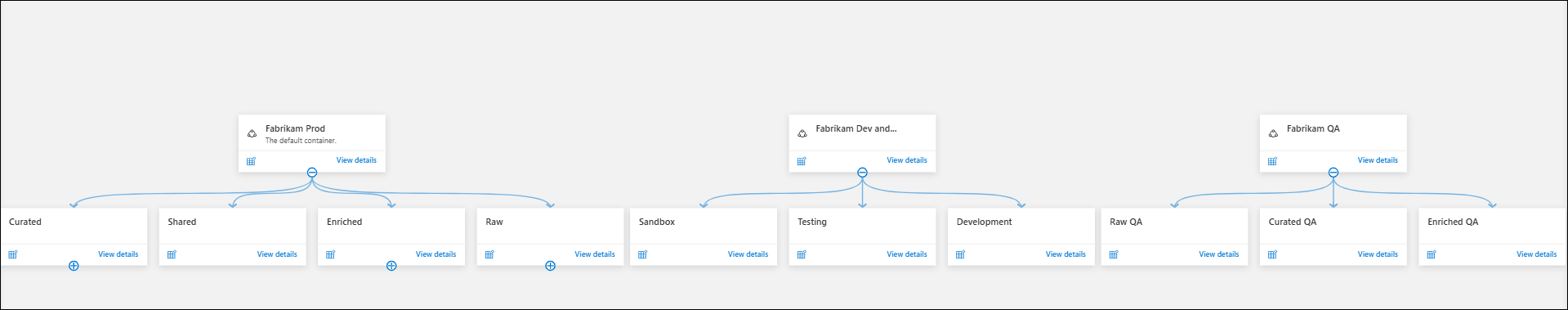 In this scenario, each region has a collection of its own under the default domain in the Microsoft Purview account. Data sources are registered and scanned in the corresponding collections in their own geographic locations. So assets also appear in the collection hierarchy for the region.