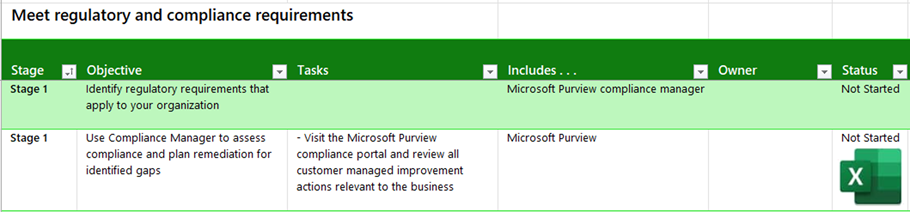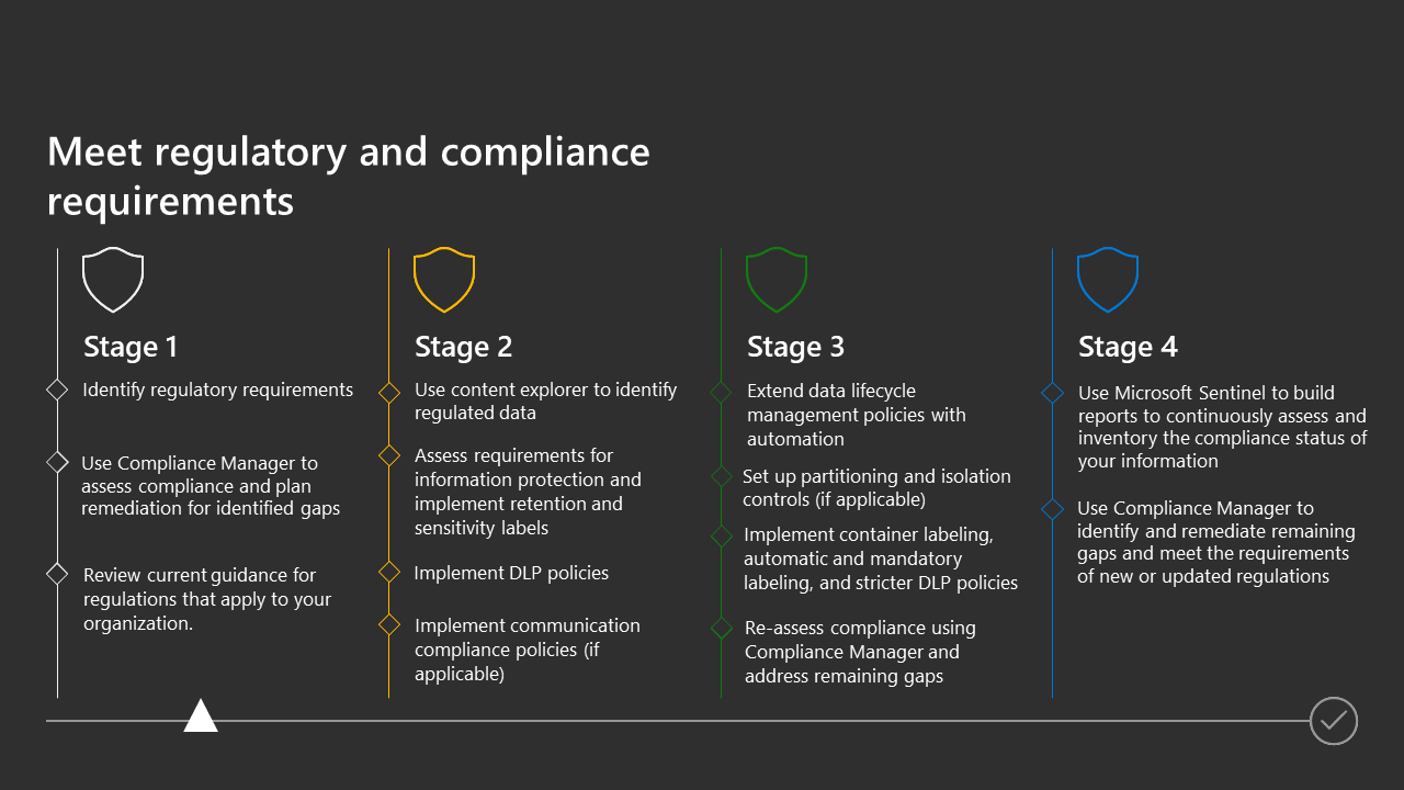 Microsoft provides resources to help you meet regulatory and compliance requirements. The following sections highlight resources for specific objectives in the four stages previously defined.