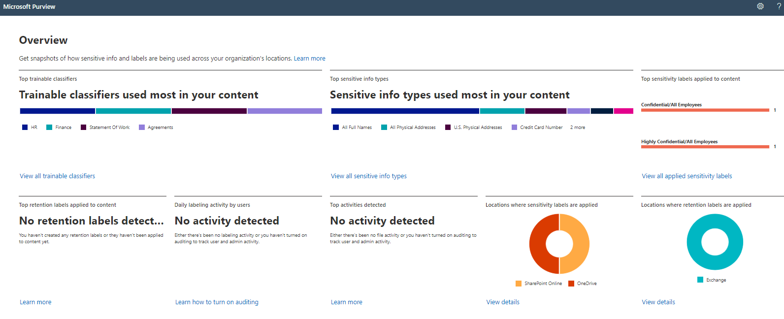 You can use content explorer to monitor the status of organizational compliance. For data classification, content explorer provides a view of the landscape and spread of sensitive information within your organization. From trainable classifiers to different types of sensitive data—either through adaptive scopes or manually created sensitivity labels—your administrators can see whether the prescribed sensitivity schema is being applied correctly throughout the organization. This is also an opportunity to identify specific areas of risk where sensitive information is consistently shared in Exchange, SharePoint, and OneDrive. Here's an example.
