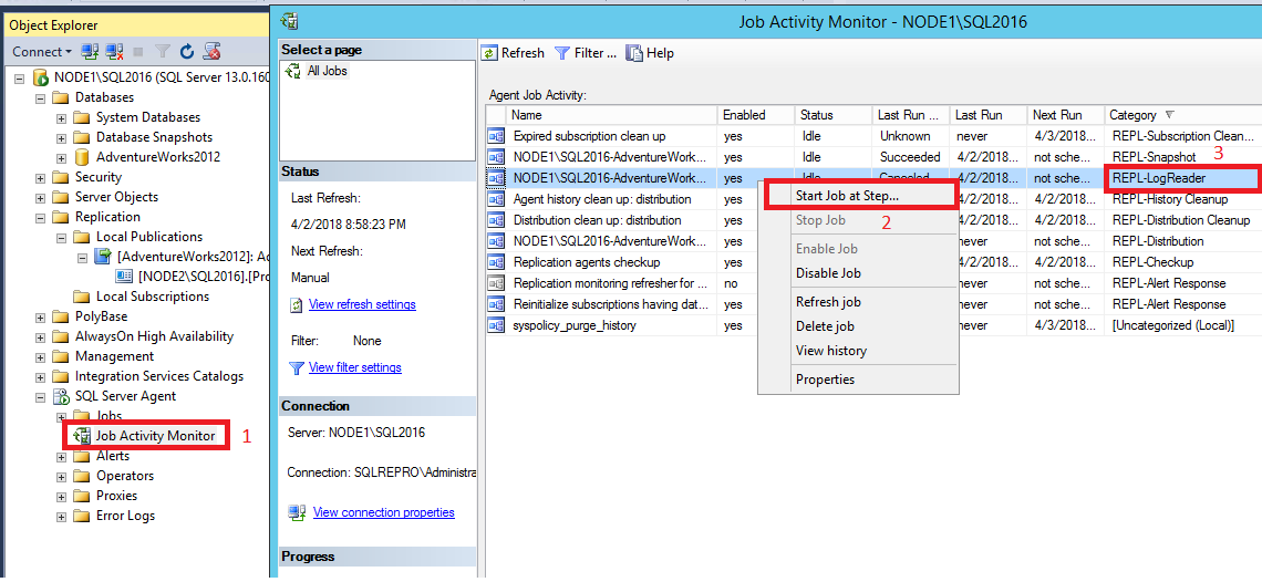 6. Restart the Log Reader Agent by right-clicking the agent > Stop Job at Step. Refresh by selecting the Refresh icon from the toolbar. Right-click the agent > Start Job at Step.