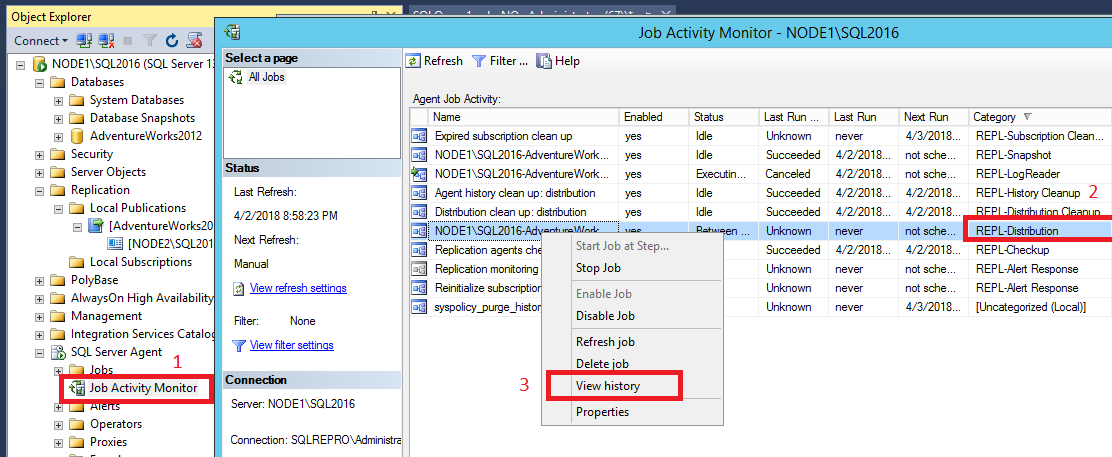 8. This error indicates that the Distribution Agent couldn't connect to the subscriber, because the login failed for user NODE2\repl_distribution. To investigate further, connect to the subscriber and open the current SQL Server error log under the Management node in Object Explorer: