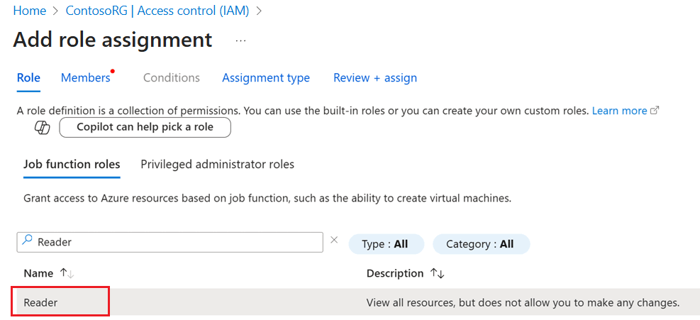 Screenshot of finding the Reader role on the IAM page for the resource group in the Azure portal.