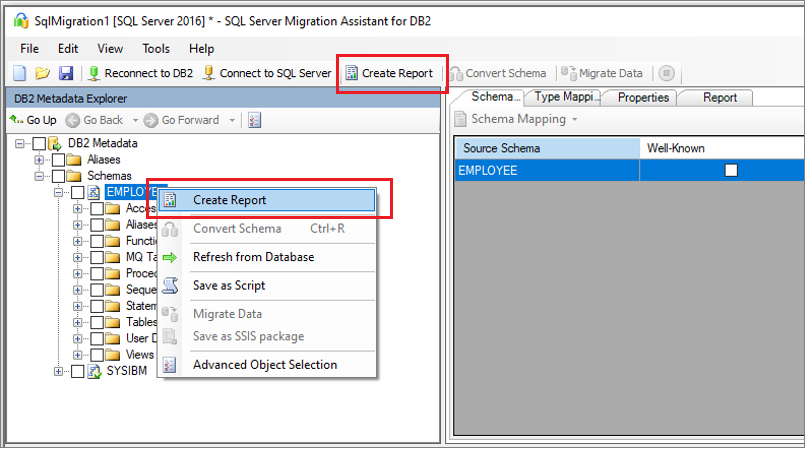 Right-click the Db2 schema you want to migrate, and then select Create report to generate an HTML report. Alternatively, you can select Create report at the upper right.