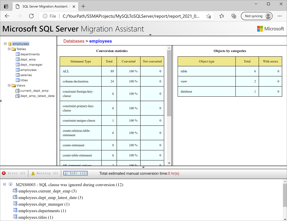 7. Review the HTML report to understand conversion statistics and any errors or warnings. You can also open the report in Excel to get an inventory of MySQL objects and the effort required to perform schema conversions. The default location for the report is in the report folder within SSMAProjects, as shown here: