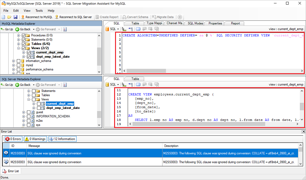 During the conversion, SSMA for MySQL prints output messages to the output pane and error messages to the Error List pane. Use the output and error information to determine whether you have to modify your MySQL databases or your conversion process to obtain the desired conversion results.