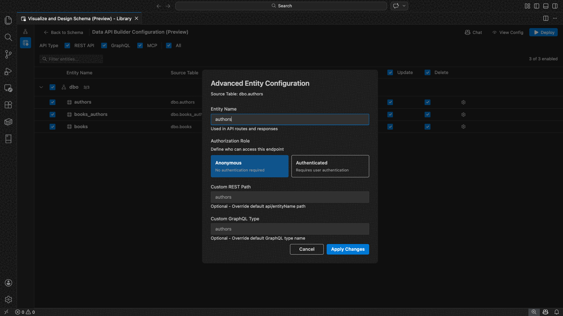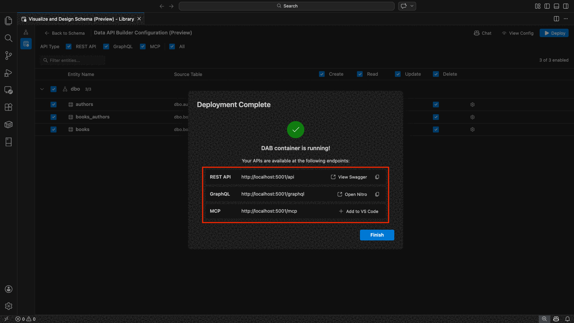 The Data API builder configuration view opens, displaying your database entities, API type options, and configuration controls.