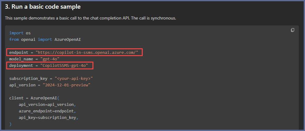 Take note of the value for Deployment name because it will be used when you configure Copilot in SSMS.