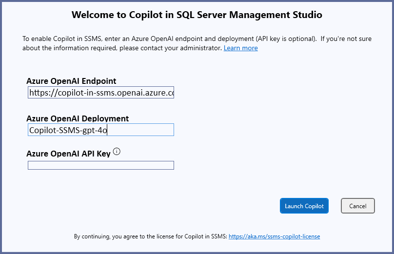 During the initial configuration of Copilot in SSMS, enter Endpoint in the Azure OpenAI Endpoint dialog.