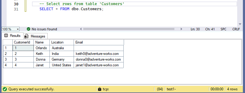 Now let's insert some rows into the Customers table that you created. Paste the following T-SQL code snippet into the query window, and then select Execute: