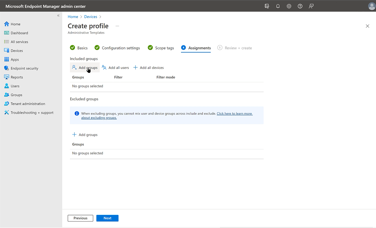 On the Assignments page, under Included groups, select Add groups.
