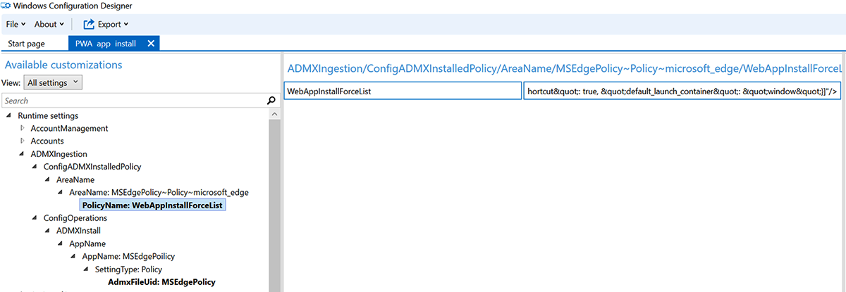 In the Available customizations pane, select PolicyName: WebAppInstallForceList and in the edit pane for WebAppInstallForceList enter PWA code as a single line of text.