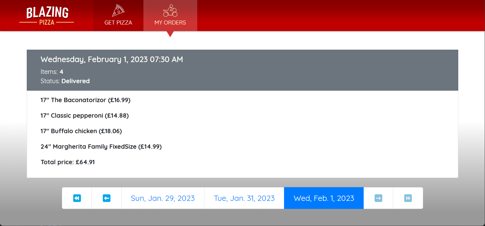 In the app, make a couple of orders and then select My Orders. Verify that you see a pagination control with a list of your orders, and can select an order to load the order details.