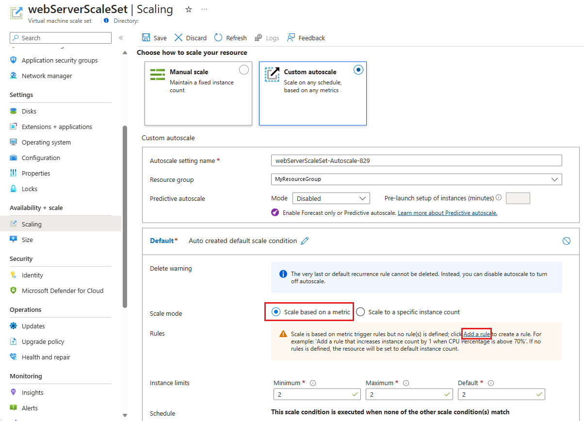 Select Custom autoscale. In the Default scale rule, ensure that the Scale mode is set to Scale based on a metric. Then select Add a rule.