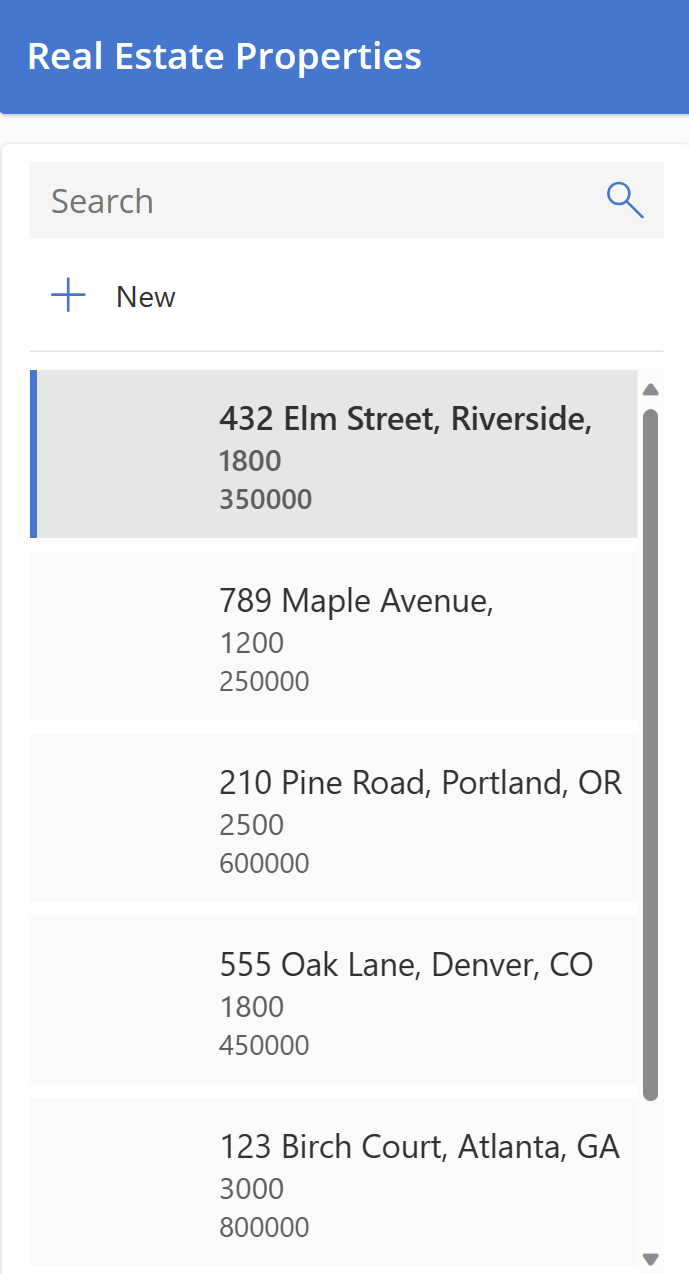 2. Select the Data icon from the left navigation bar. A Dataverse table has been created from the RealEstateProperties.xlsx Excel file.