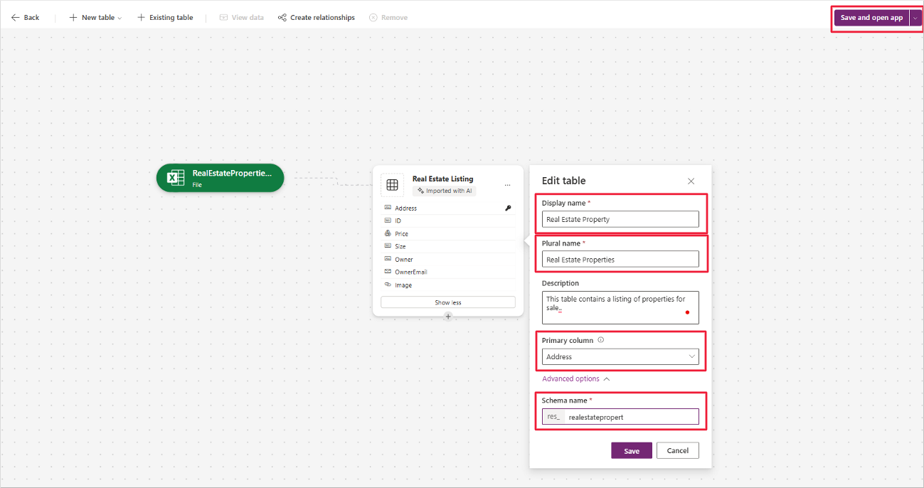 Screenshot of the imported Real Estate Property table showing Display name, Plural name, Description, Primary column, Schema name, Save button, and Save and open app button highlighted.