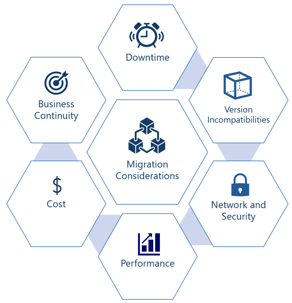 You should evaluate requirements for application downtime, version compatibility, networking and security, performance, cost, and business continuity.