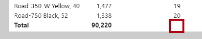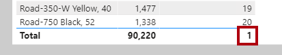 In this visual, the total row for the Product Quantity Rank measure shows one, because the total for all products is also ranked and there's only one value.