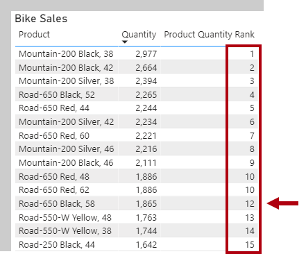 The ALL function removes filters, so RANKX ranks all products. In the following image, two products tie for tenth place, so the next product is ranked twelfth and rank 11 is skipped.