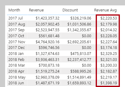 If you want to calculate the average revenue per sales order (rather than per line item), you can use the VALUES function to get a list of unique sales order numbers first. Then, AVERAGEX iterates over each sales order and averages the total revenue for each order: