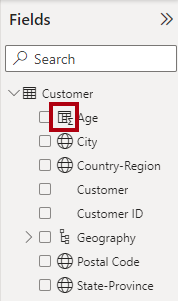 In the Data pane, calculated columns are enhanced with a special icon. The following example shows a single calculated column in the Customer table called Age.
