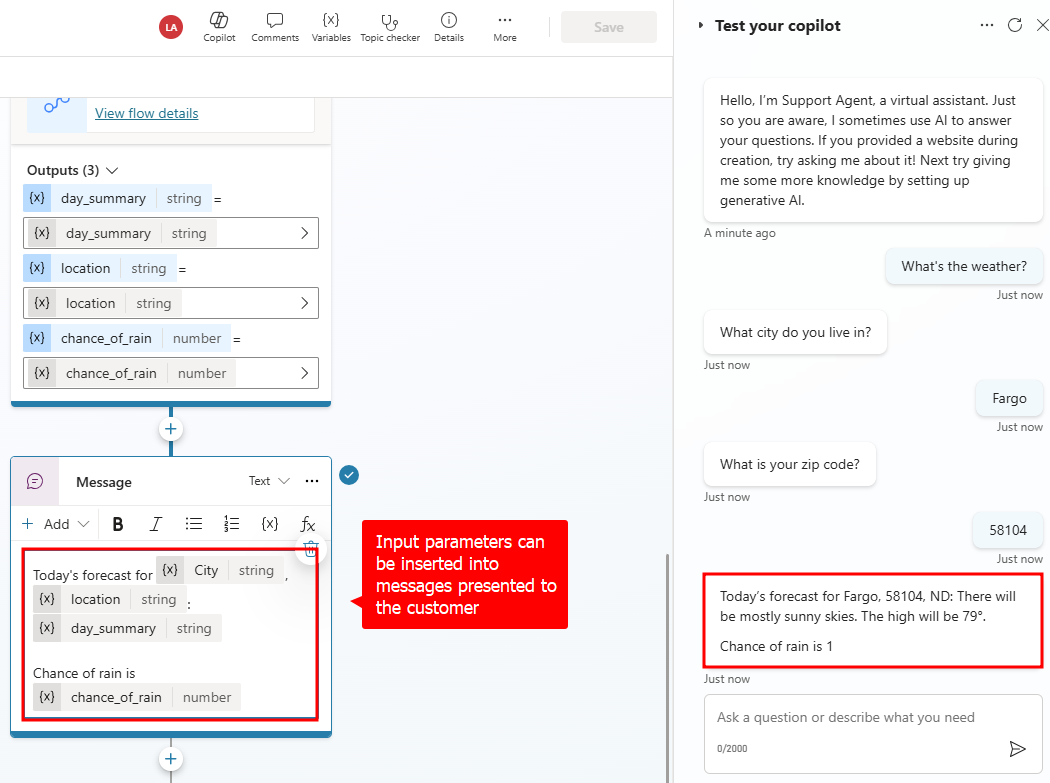Variables that are defined in your agent can be to supply values to input parameters and consume values from output parameters. For example, a customer's response to the "What city do you live in?" question could be used as the value for a City input parameter.