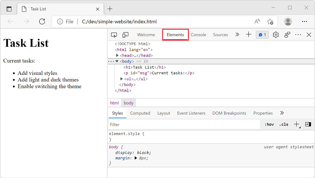 <!DOCTYPE html> <html lang="en"> <head> <meta charset="utf-8"> <meta http-equiv="X-UA-Compatible" content="IE=edge"> <meta name="viewport" content="width=device-width, initial-scale=1.0"> <title>Simple website</title> <link rel="stylesheet" href="main.css"> </head> <body> <h1>Task List</h1> <p id="msg">Current tasks:</p> <ul> <li class="list">Add visual styles</li> <li class="list">Add light and dark themes</li> <li>Enable switching the theme</li> </ul> </body> </html>