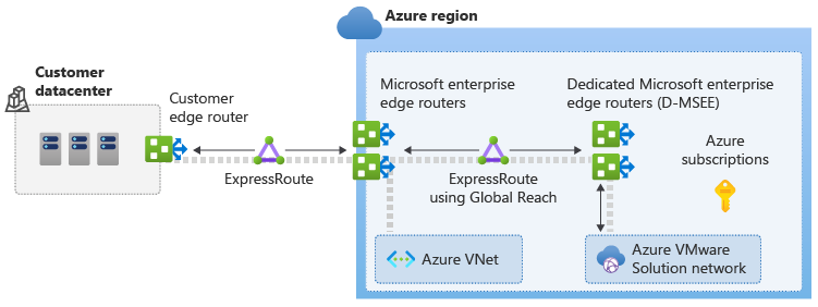 ExpressRoute Global Reach is used to connect private clouds to on-premises environments. The connection requires a virtual network with an ExpressRoute circuit to on-premises in your subscription. There are two options for interconnectivity in the private cloud for Azure VMware Solution: