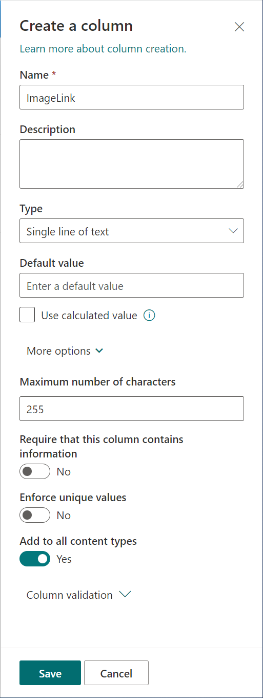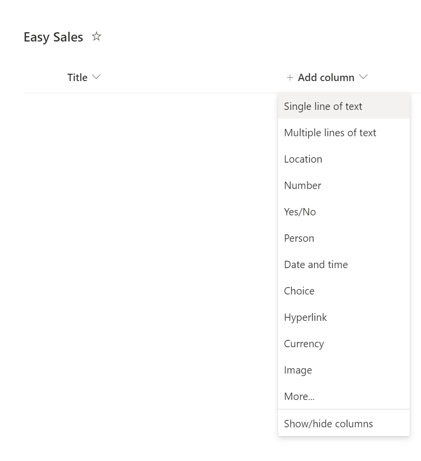 In the created Easy sales list, select + Add column to add a column of a specific type. The list below shows the columns that need to be created, with their names and types in this format: Name of the Column - Column type.