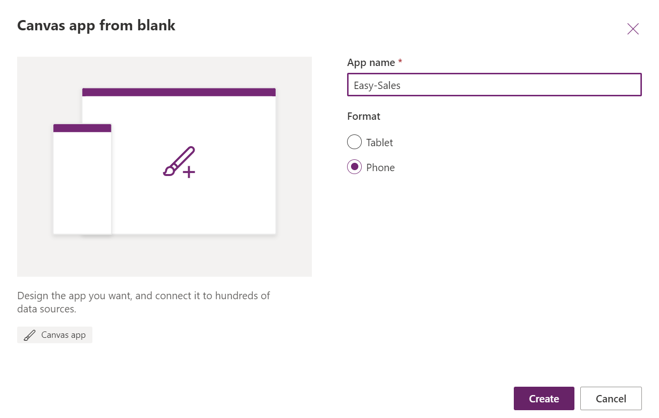 Specify a name for your app; for example, Easy-Sales. Select Phone, and then select Create.