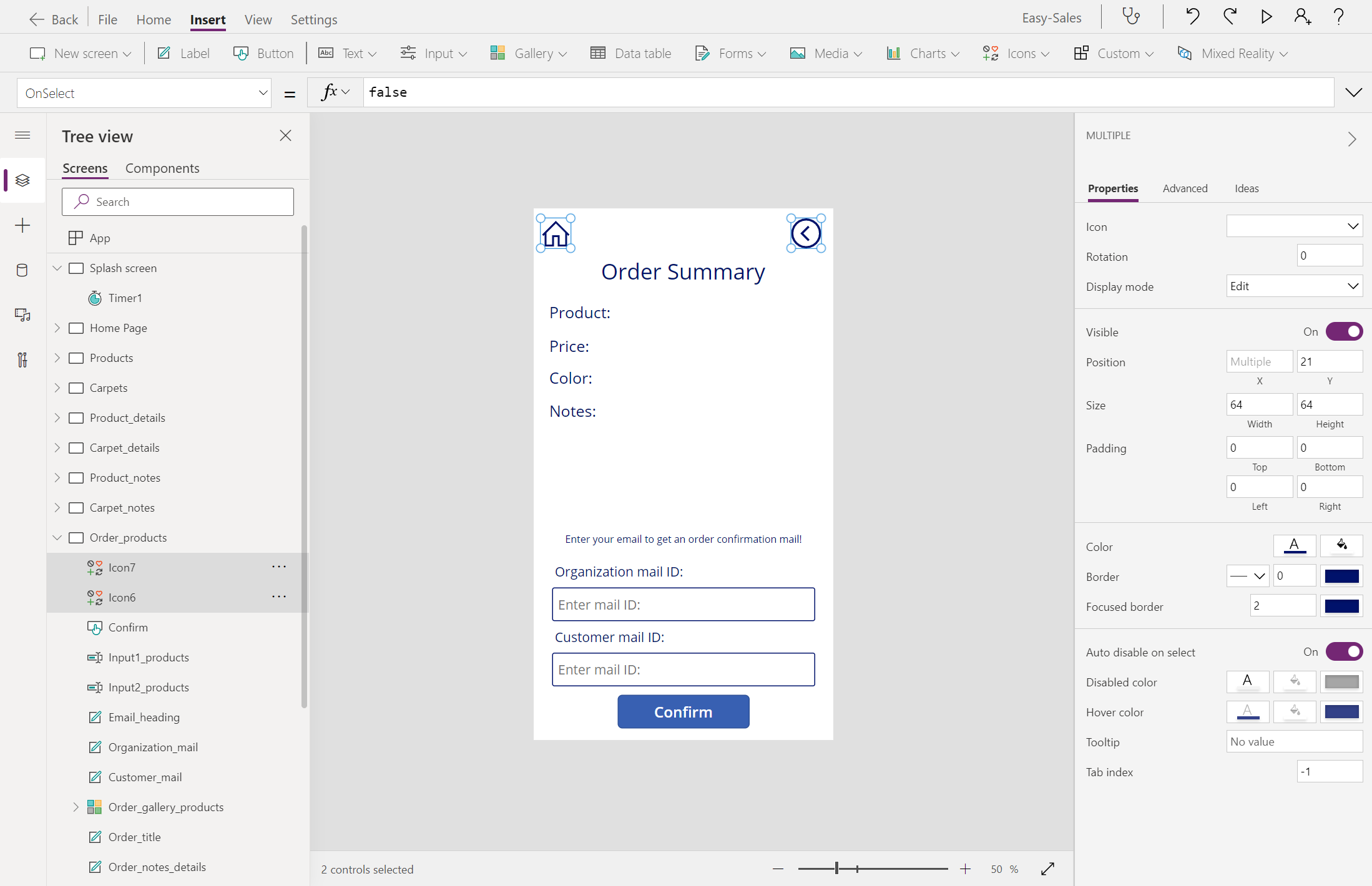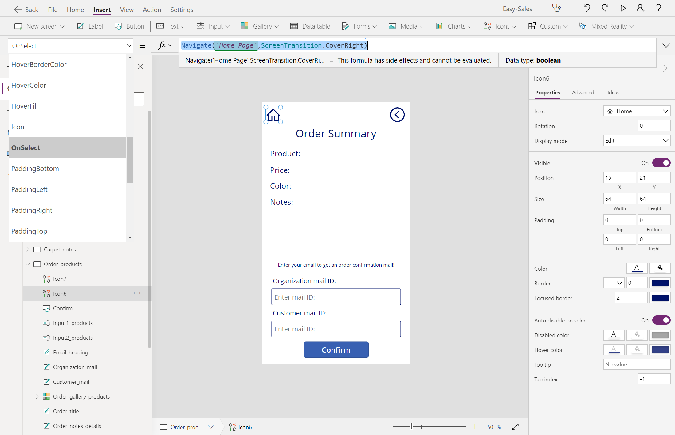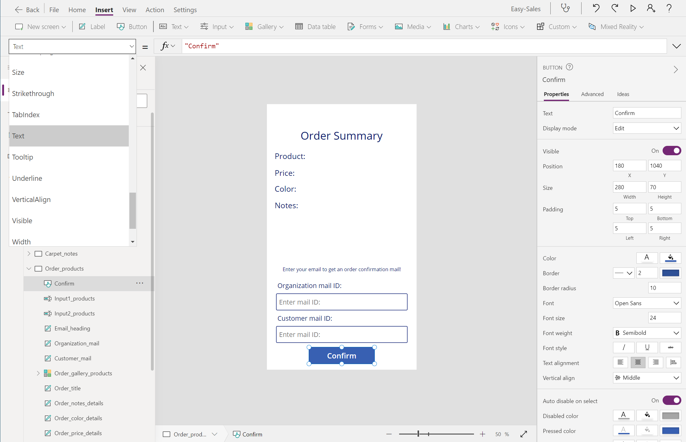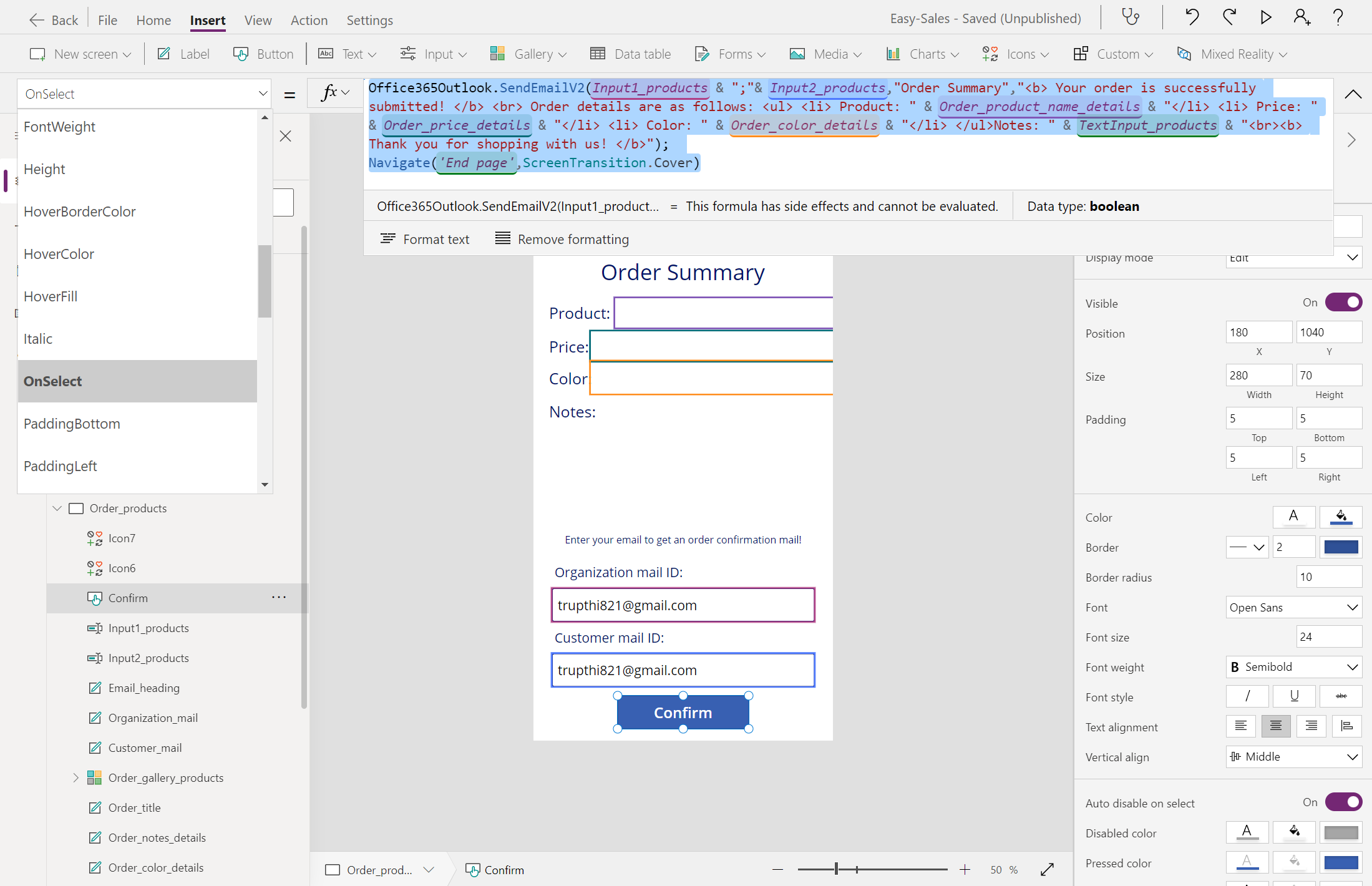 Open Order_products and then configure the OnSelect property of the Confirm button by adding the following lines: