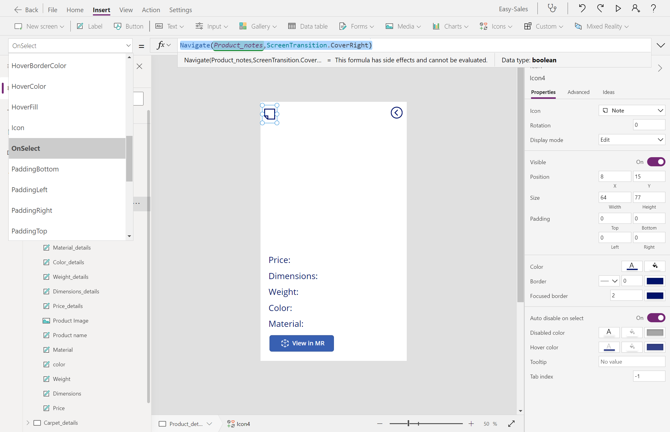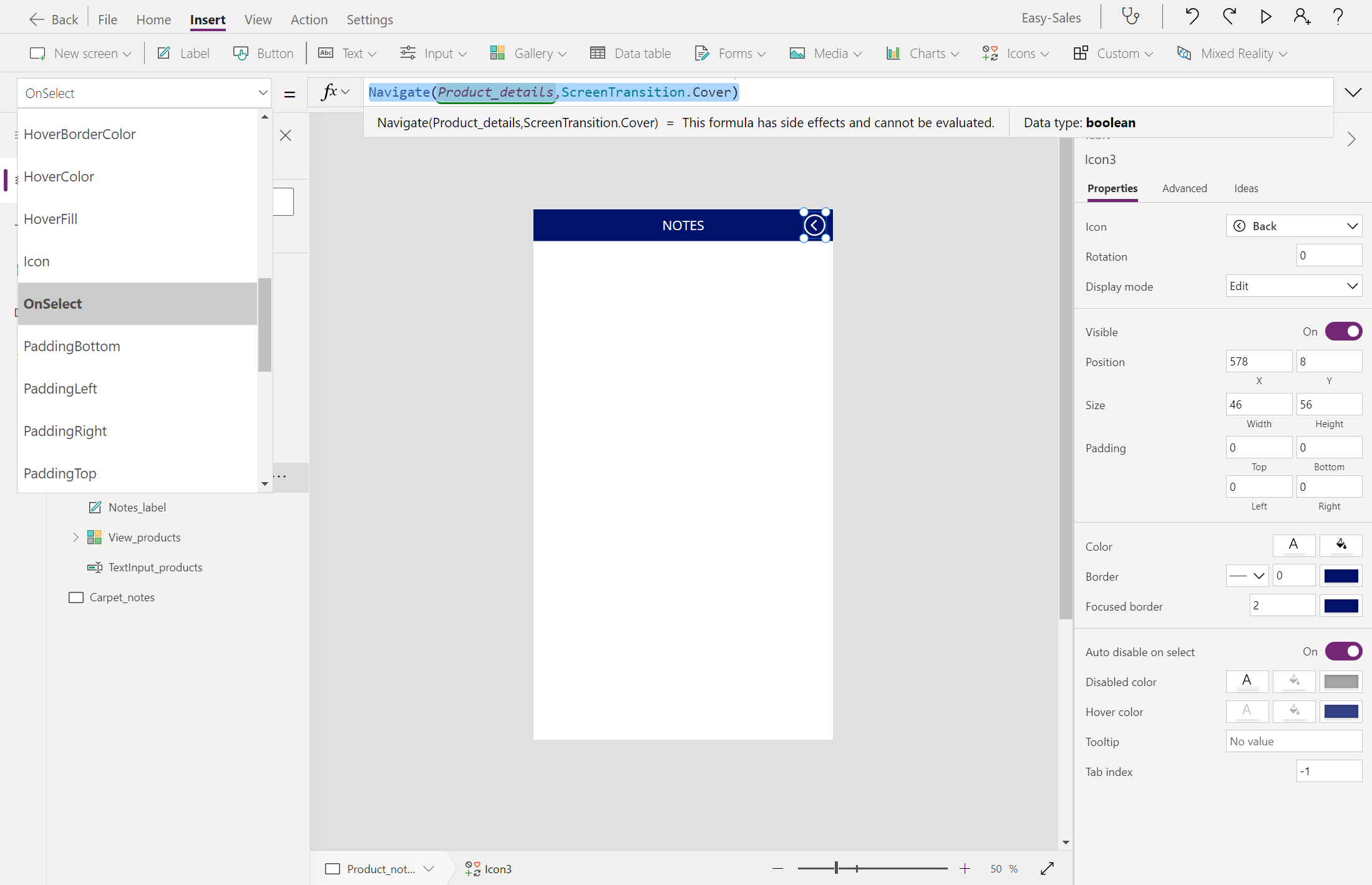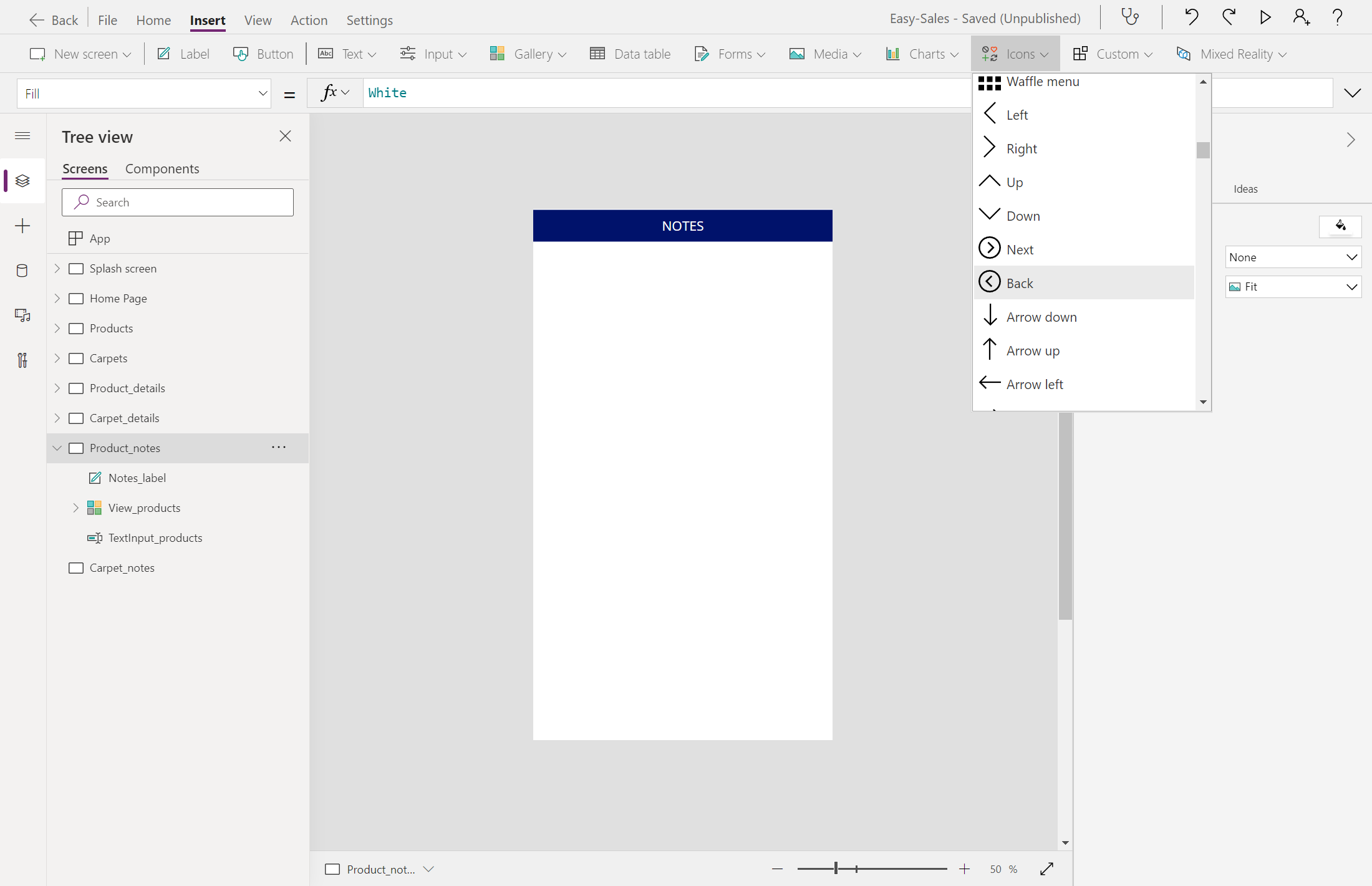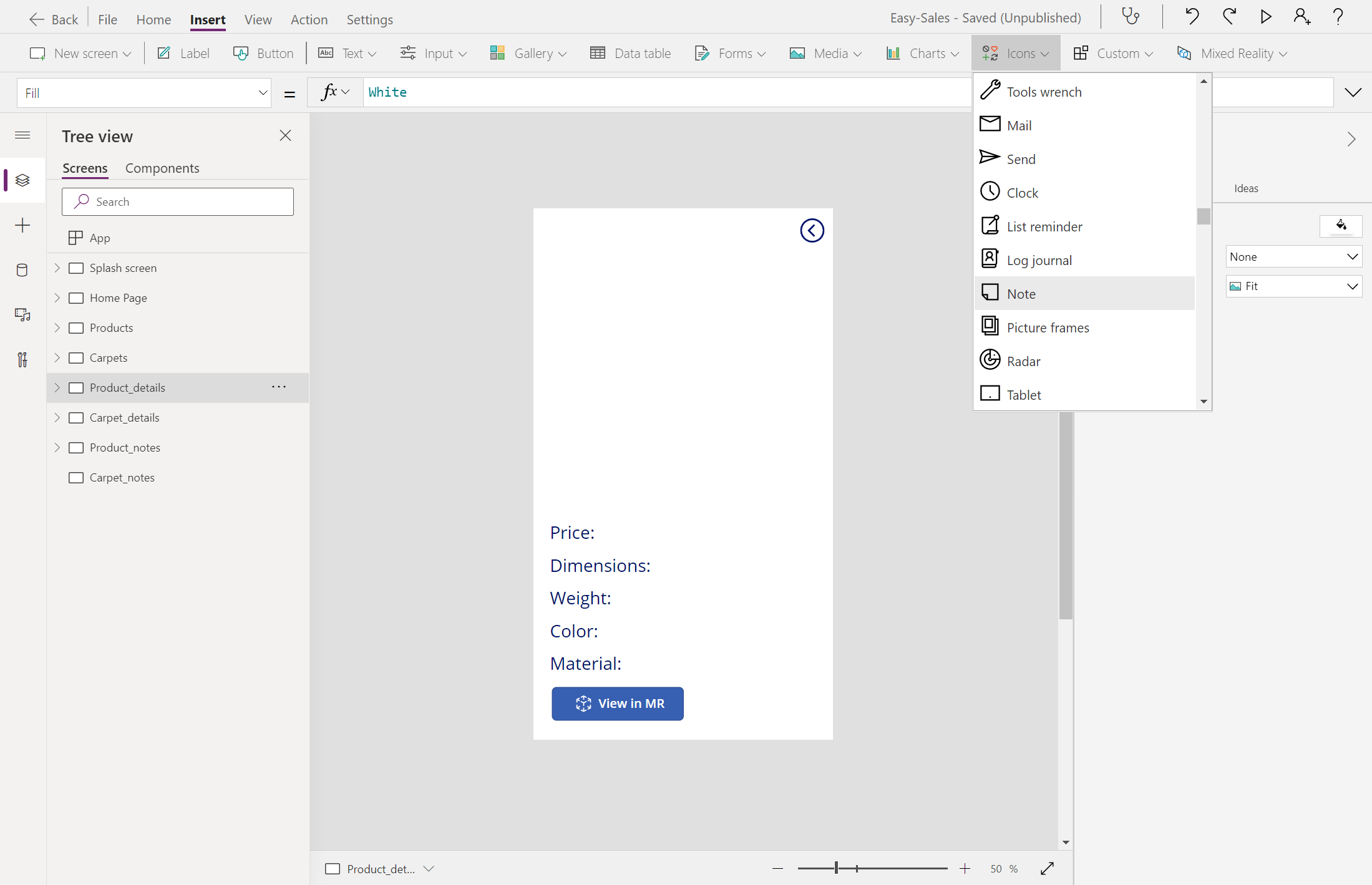 Navigate(Product_details,ScreenTransition.Cover)Switch to the Product_details screen and add a Note icon from the Icons dropdown on the Insert tab.