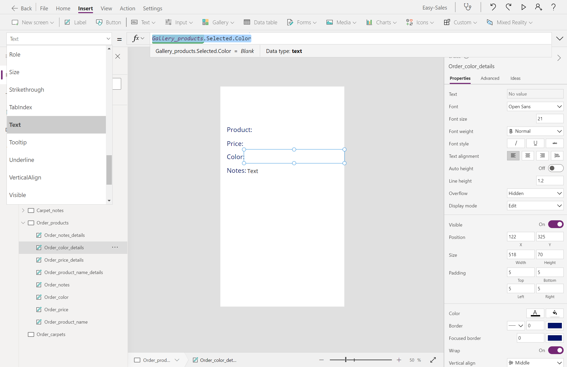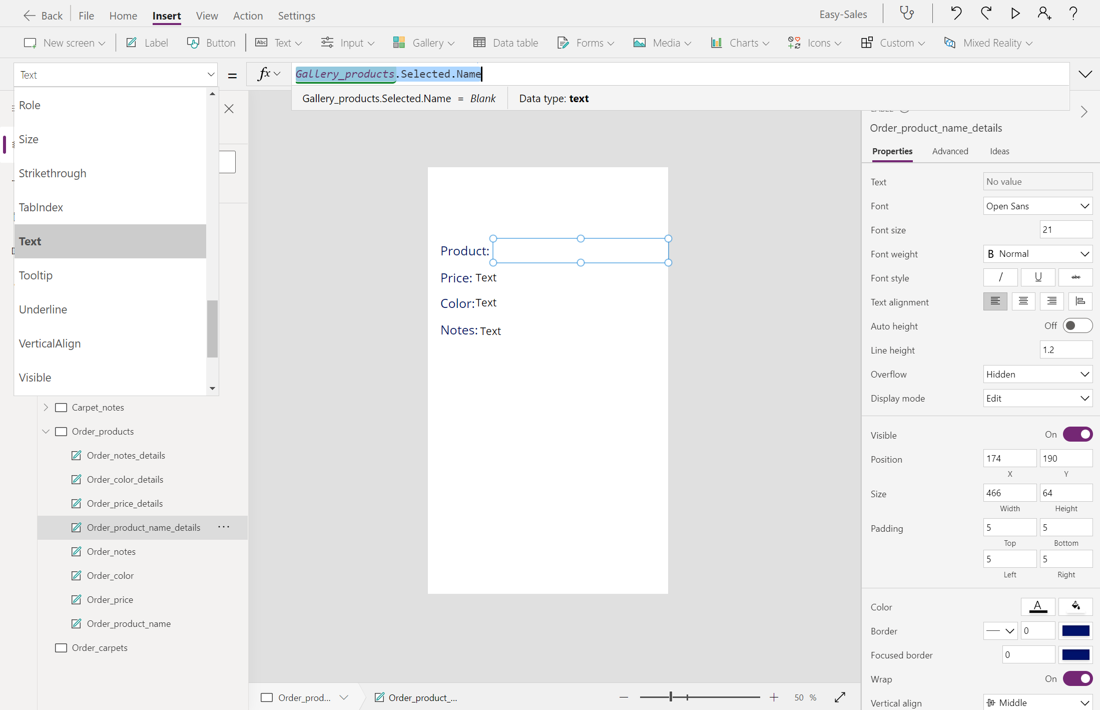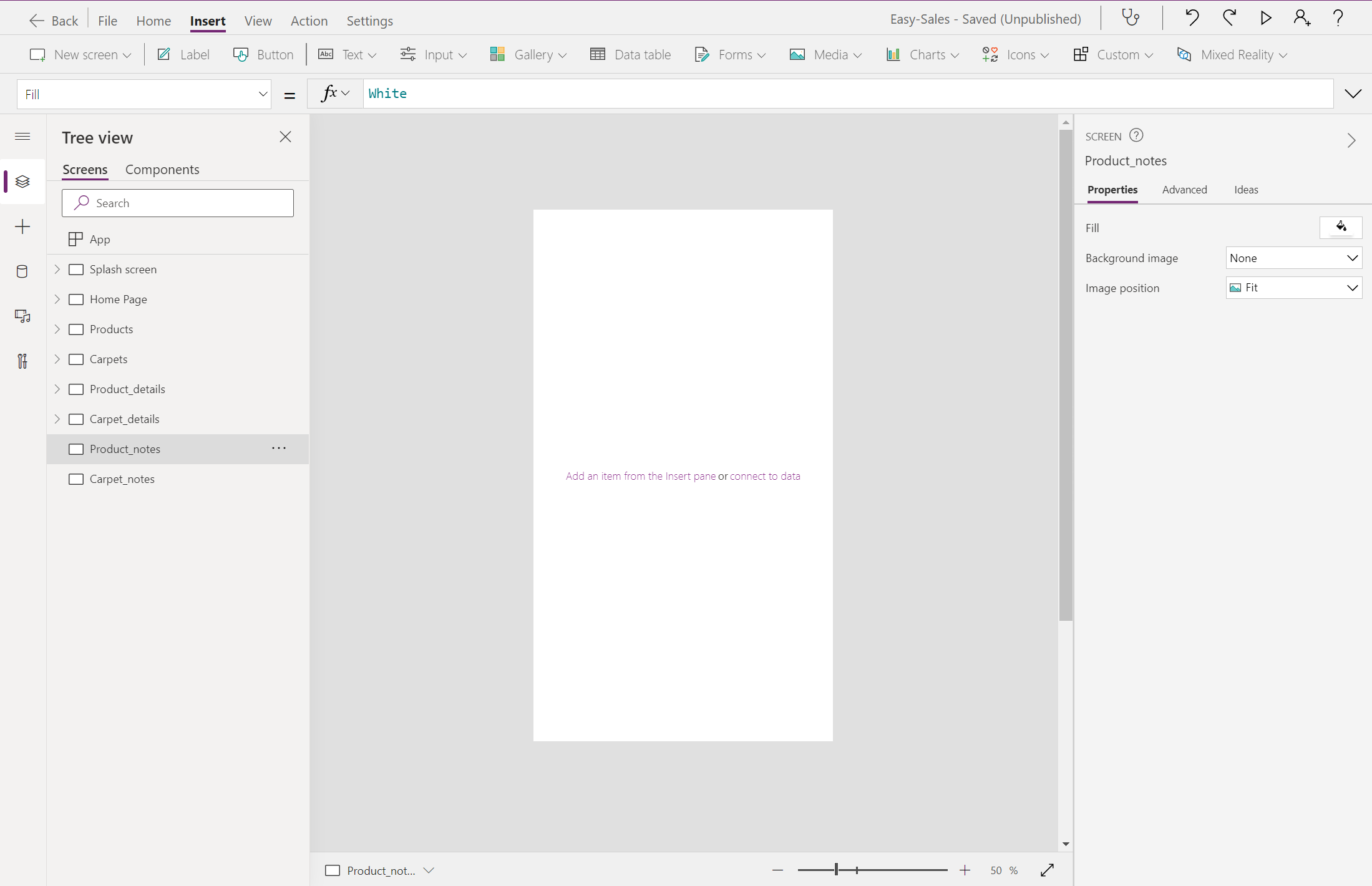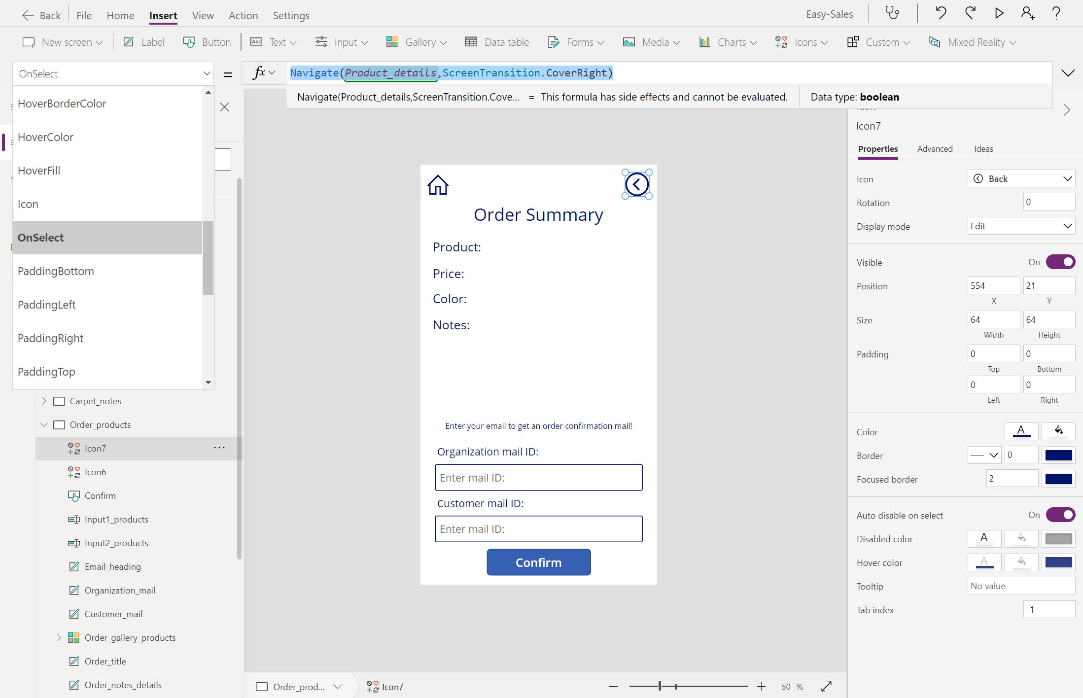 Navigate(Product_details,ScreenTransition.Cover)Switch to the Product_details screen and add a Note icon from the Icons dropdown on the Insert tab.
