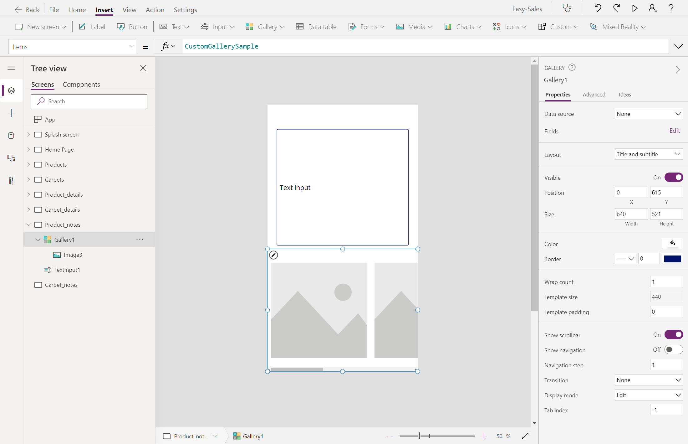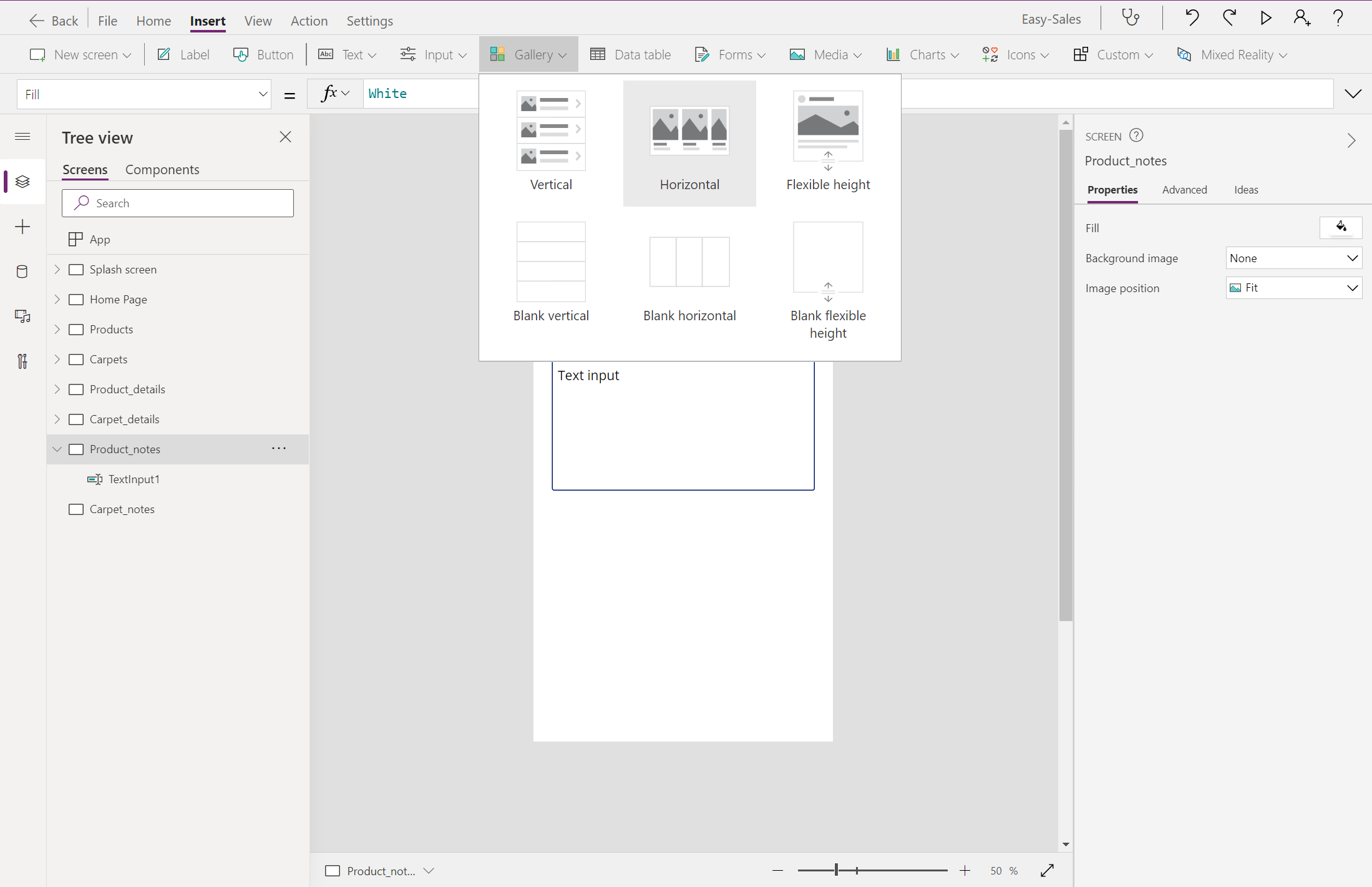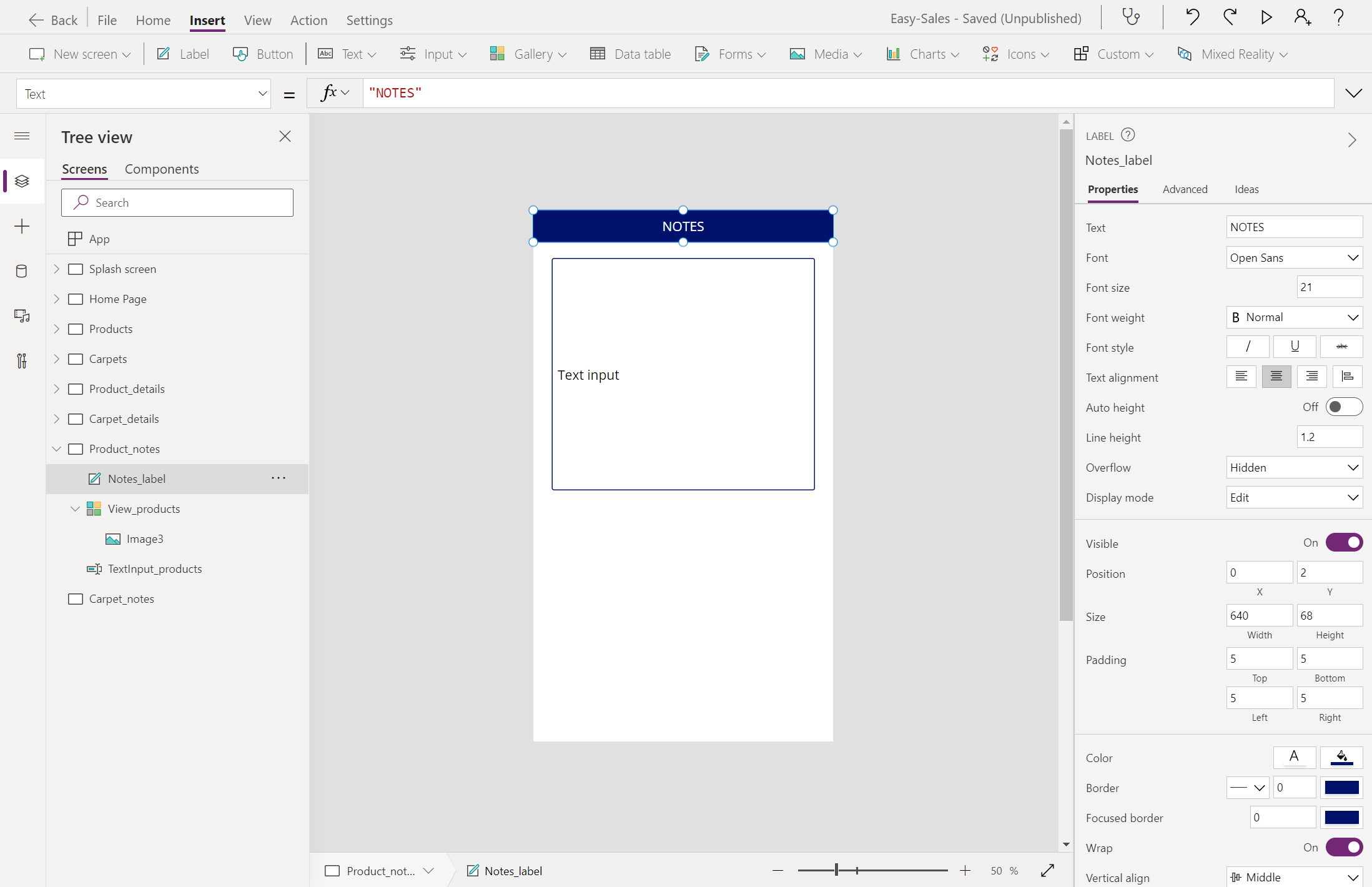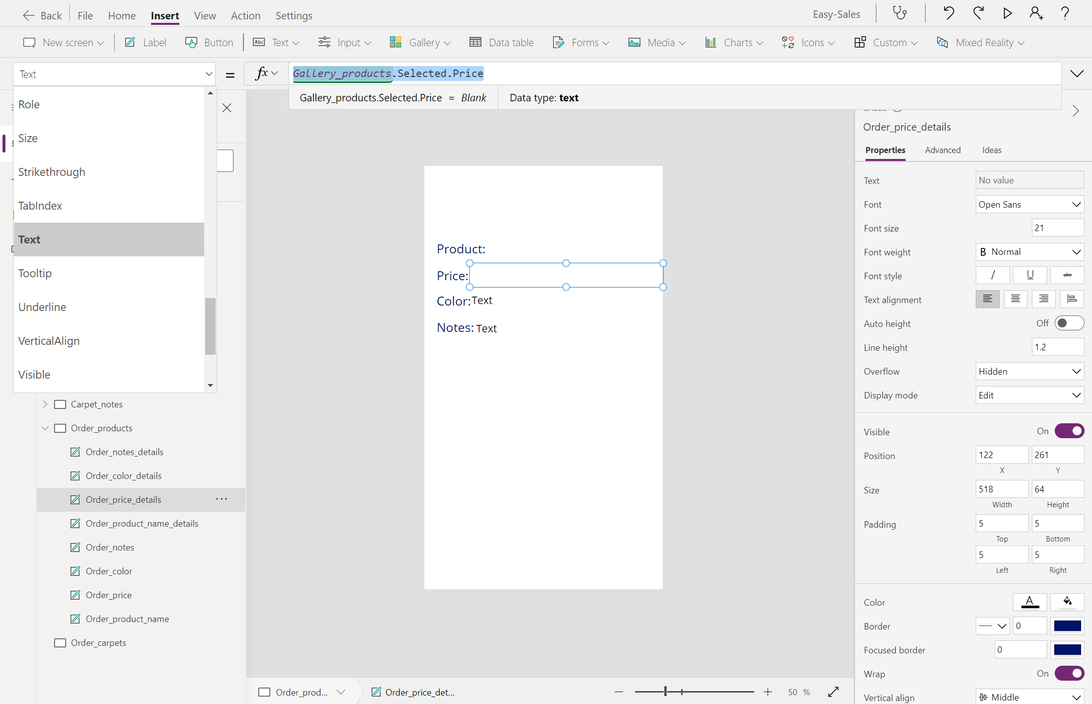 Navigate(Product_details,ScreenTransition.Cover)Switch to the Product_details screen and add a Note icon from the Icons dropdown on the Insert tab.