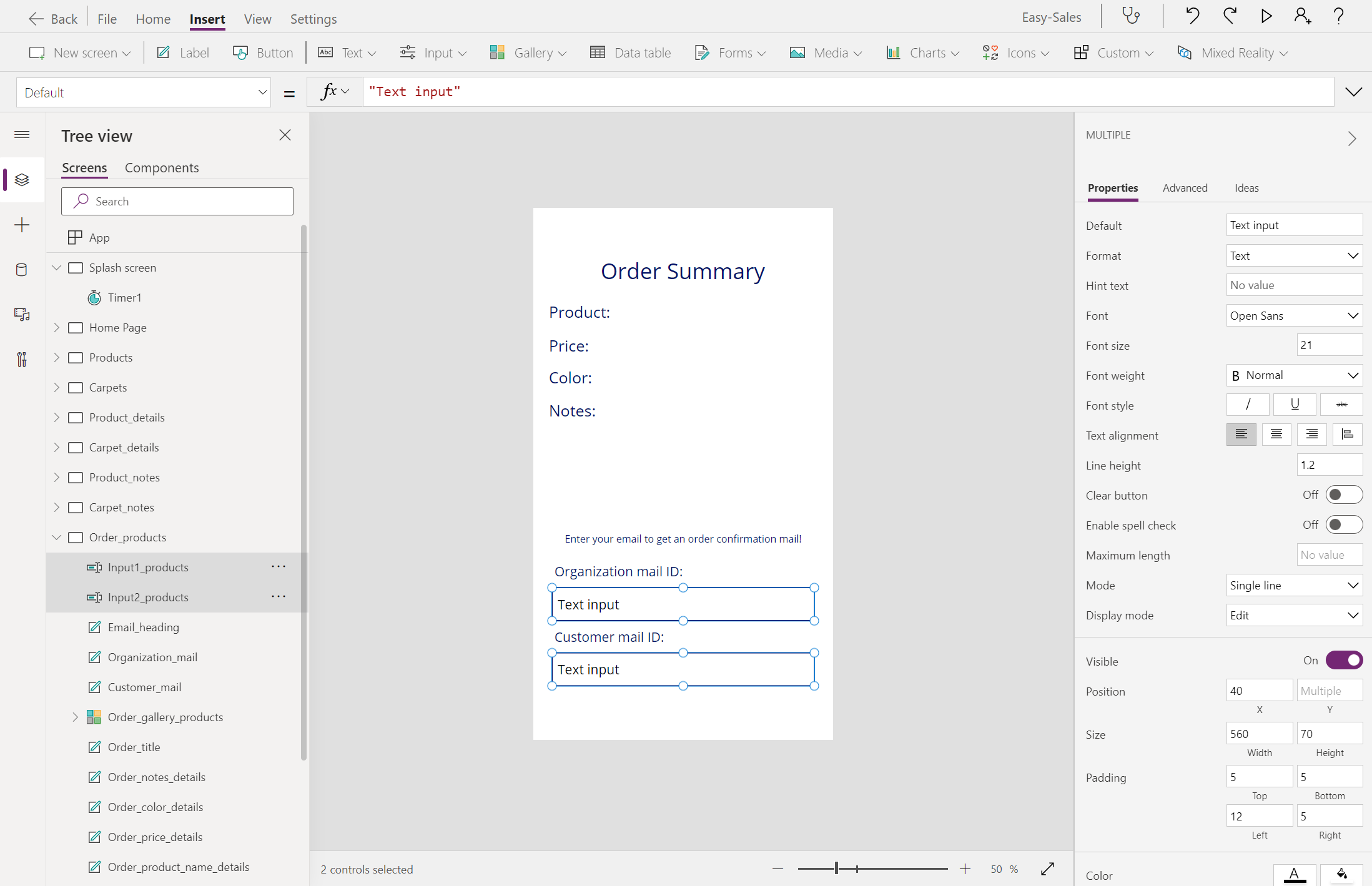 Expand the Input dropdown and select Text input. Add two Text input components to the screen and position them as shown in the image. Rename them Input1_products and Input2_products.
