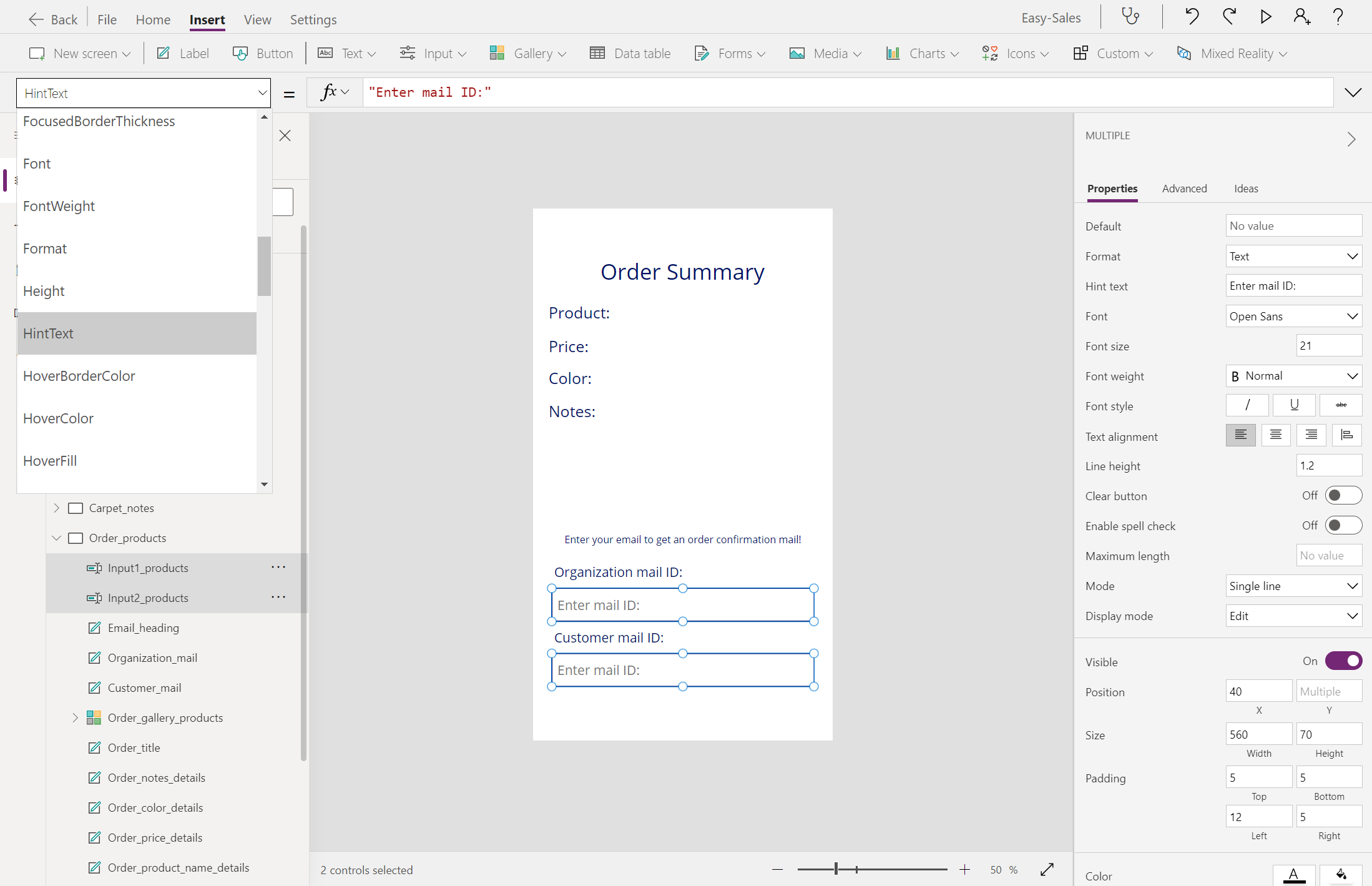 Office365Outlook.SendEmailV2(Input1_products & ";"& Input2_products,"Order Summary","<b> Your order is successfully submitted! </b> <br> Order details are as follows: <ul> <li> Product: " & Order_product_name_details & "</li> <li> Price: " & Order_price_details & "</li> <li> Color: " & Order_color_details & "</li> </ul>Notes: " & TextInput_products & "<br><b> Thank you for shopping with us! </b>"); Navigate('End page',ScreenTransition.Cover)Note