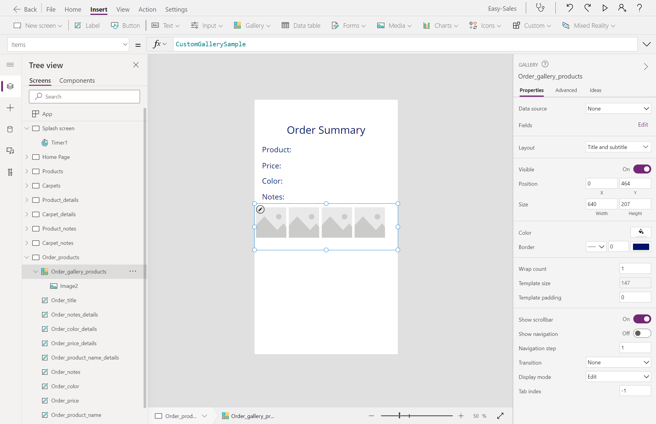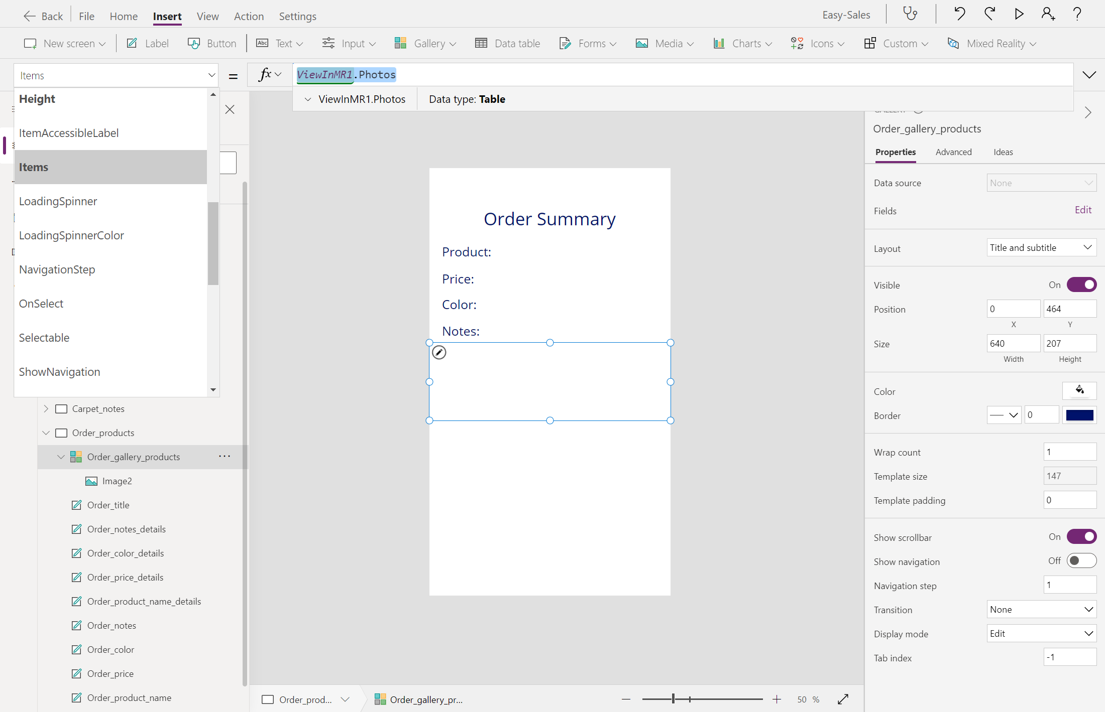 Expand the Gallery dropdown and select Horizontal. Retain only the image; delete other components of the Gallery. Rename it Order_gallery_products