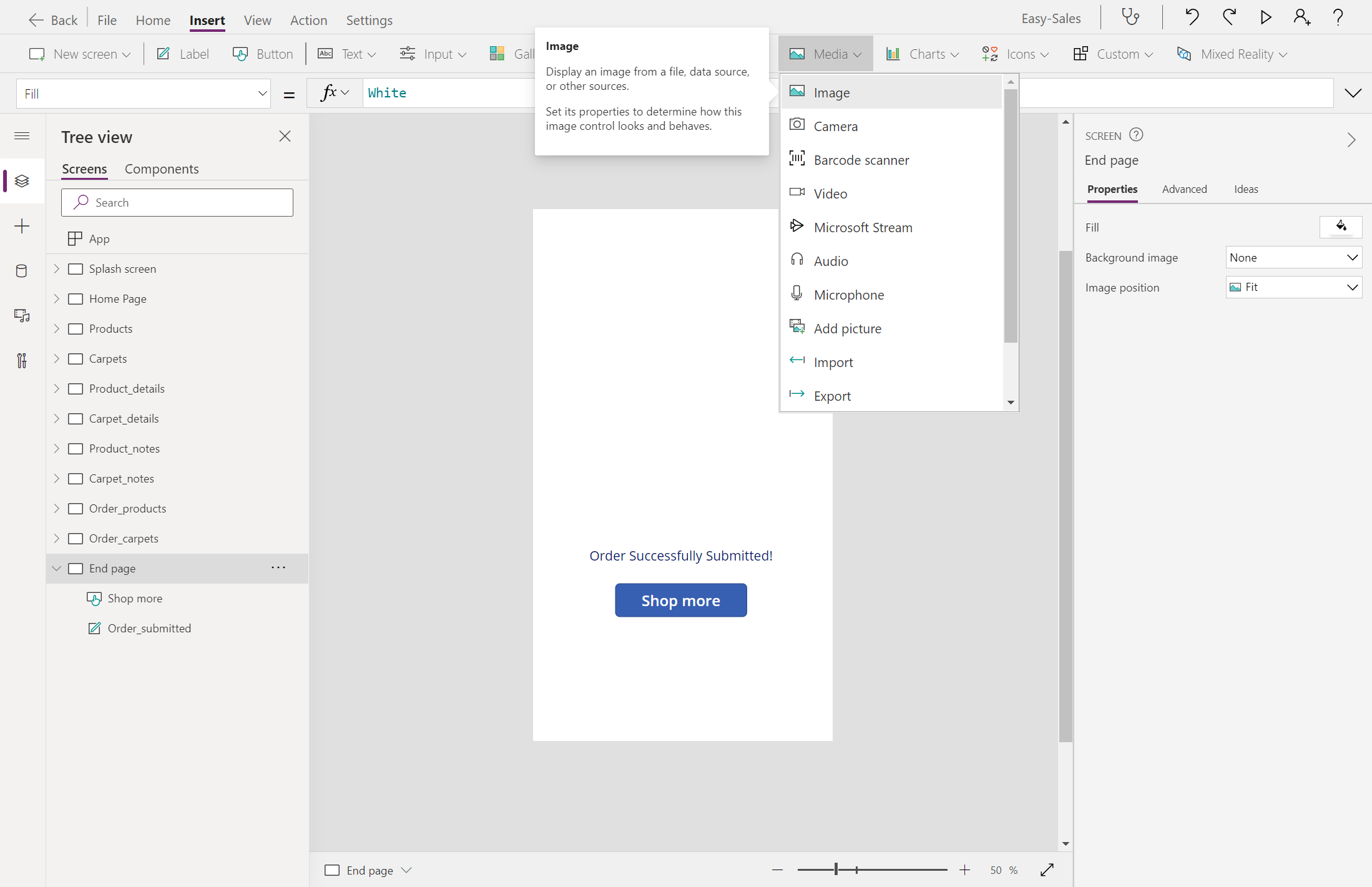 Navigate('Home Page',ScreenTransition.Cover)Expand the Media dropdown and select Image to add an image component to the End page.