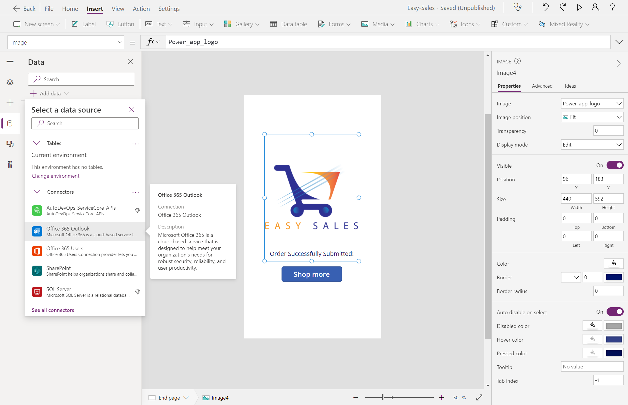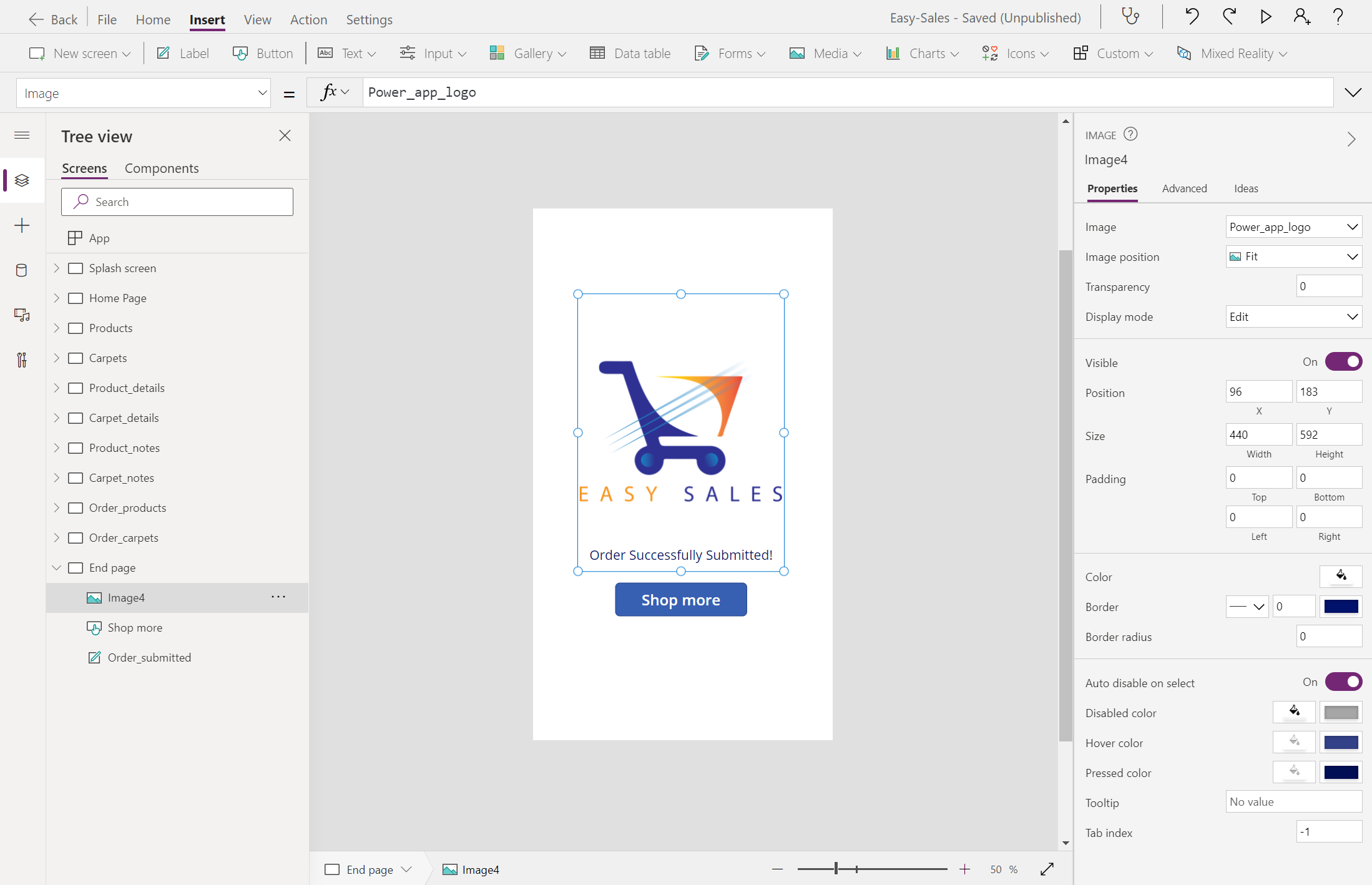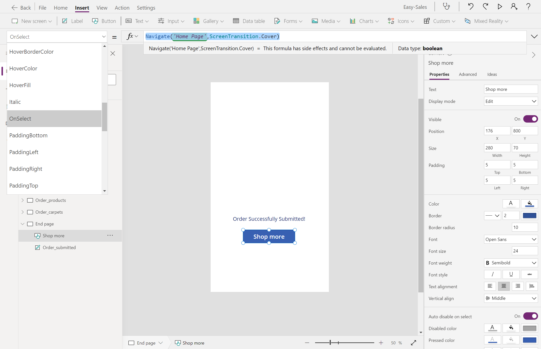 Add a Button at the bottom of the screen. Configure the Text property of the button by adding Shop more. Let's direct the user to the home page: select the Shop more button, then add the following line in the OnSelect property.