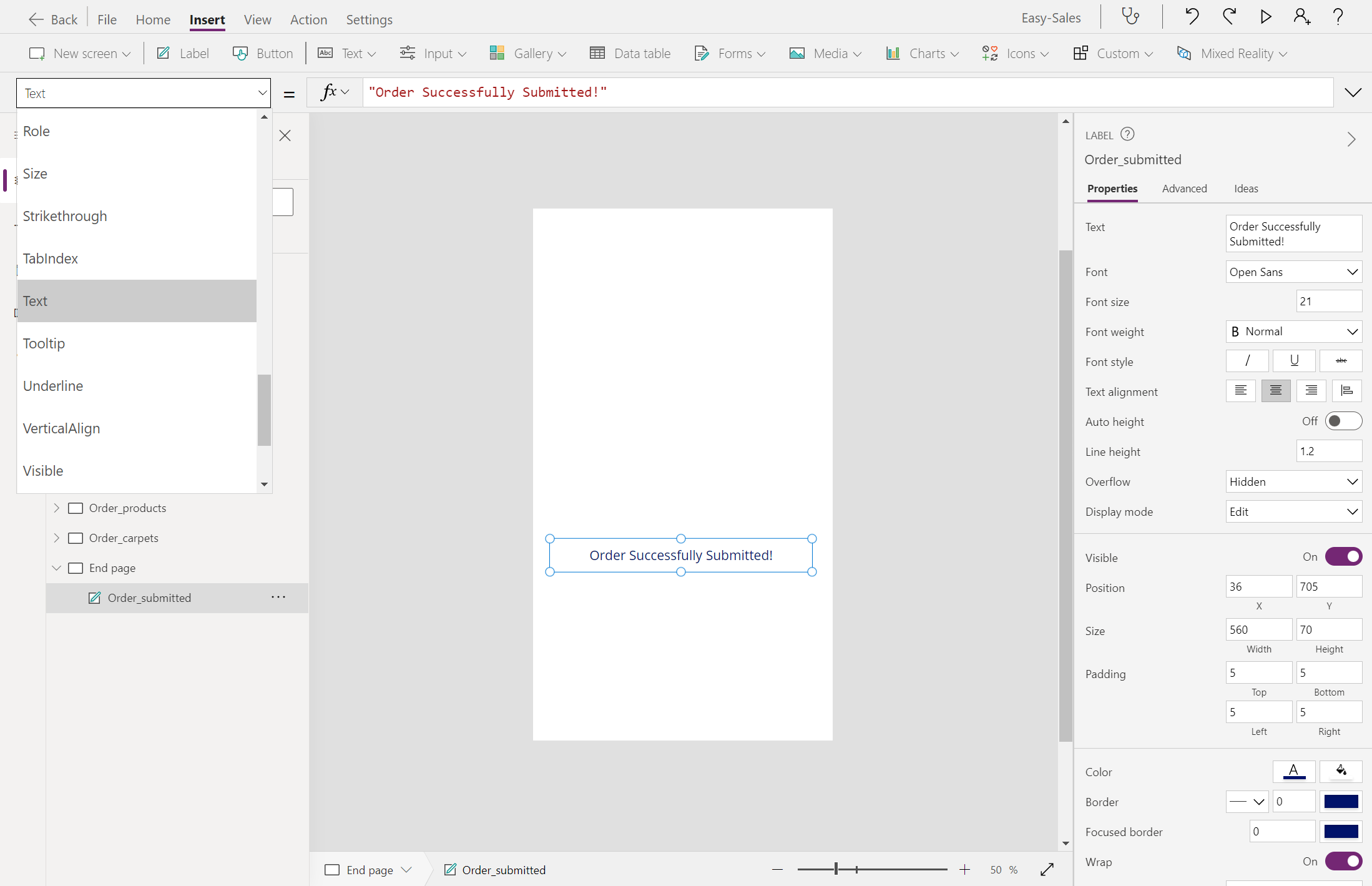 Add a Label and change its display text to Order Successfully Submitted!. Position the label as required on the screen.