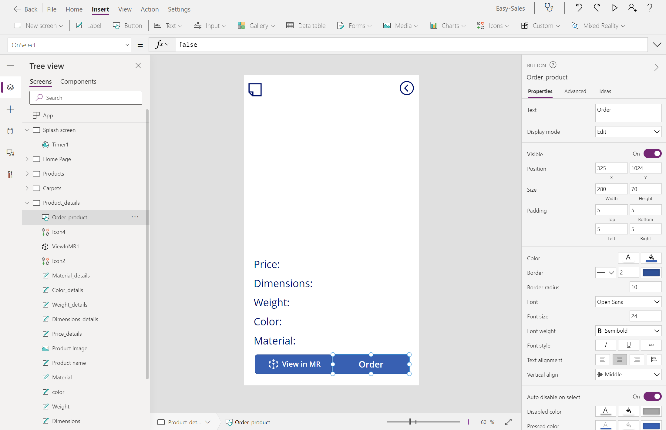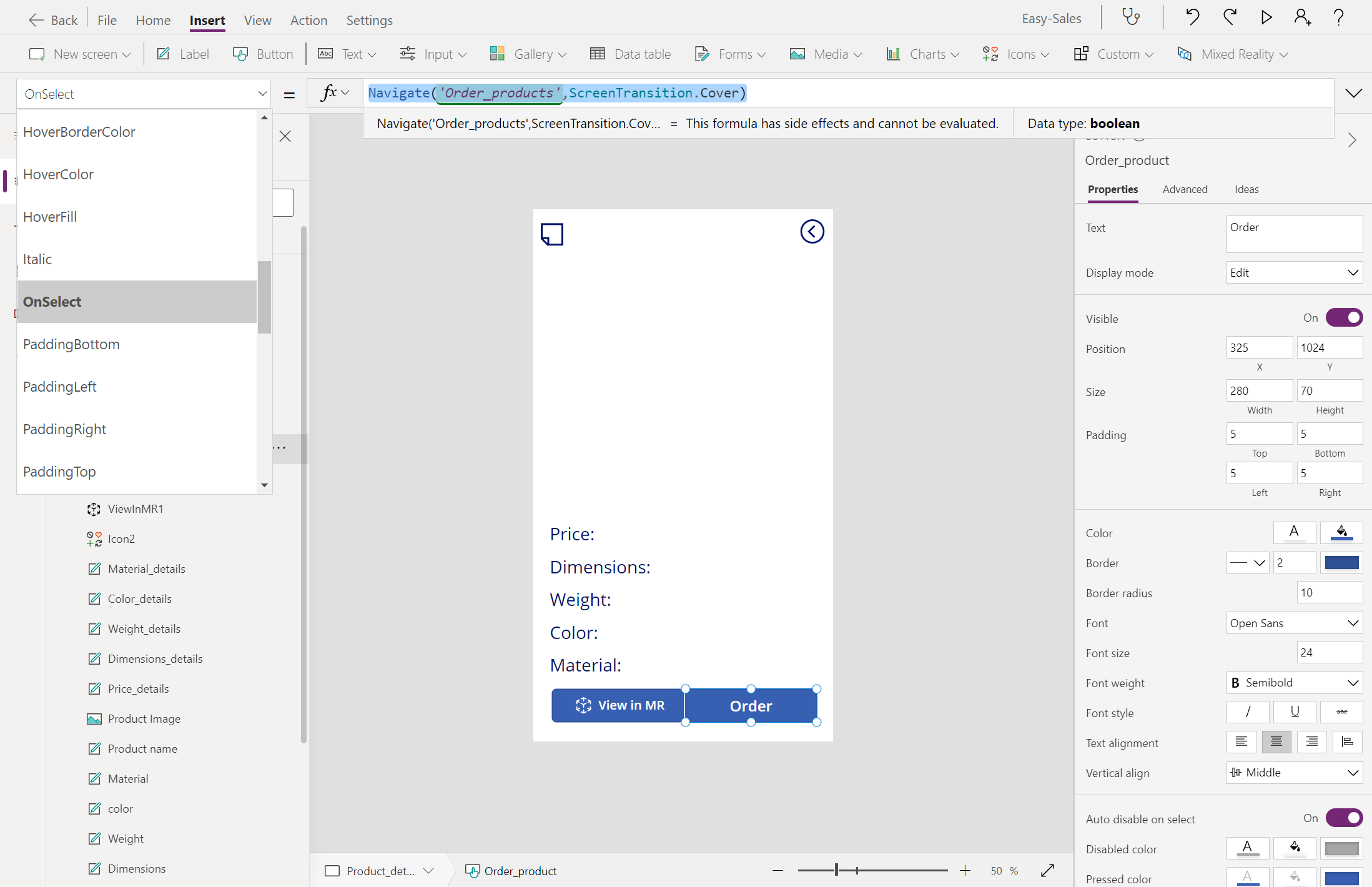 Select the Product_details screen and then configure the OnSelect property of the Order button as follows: