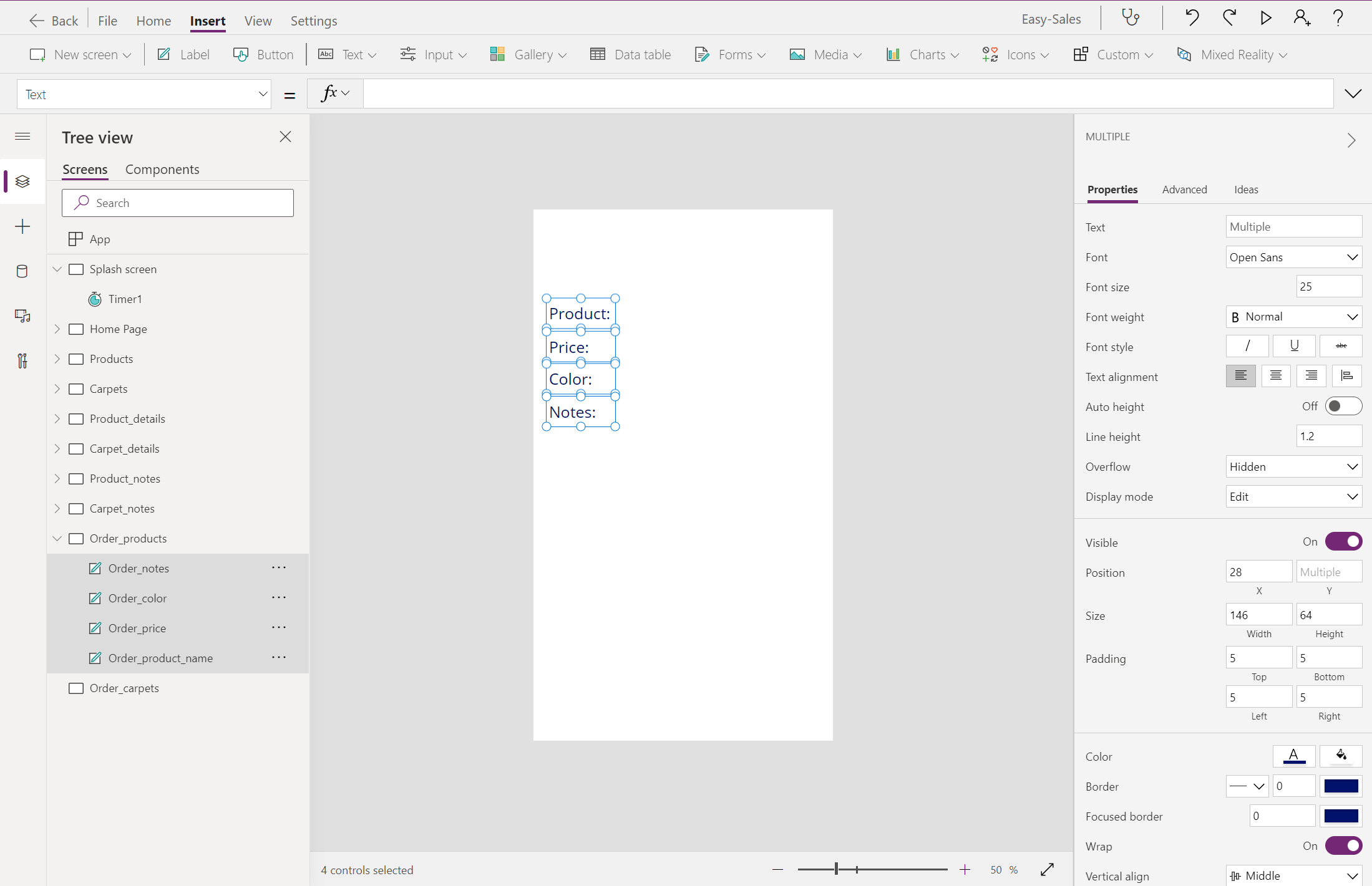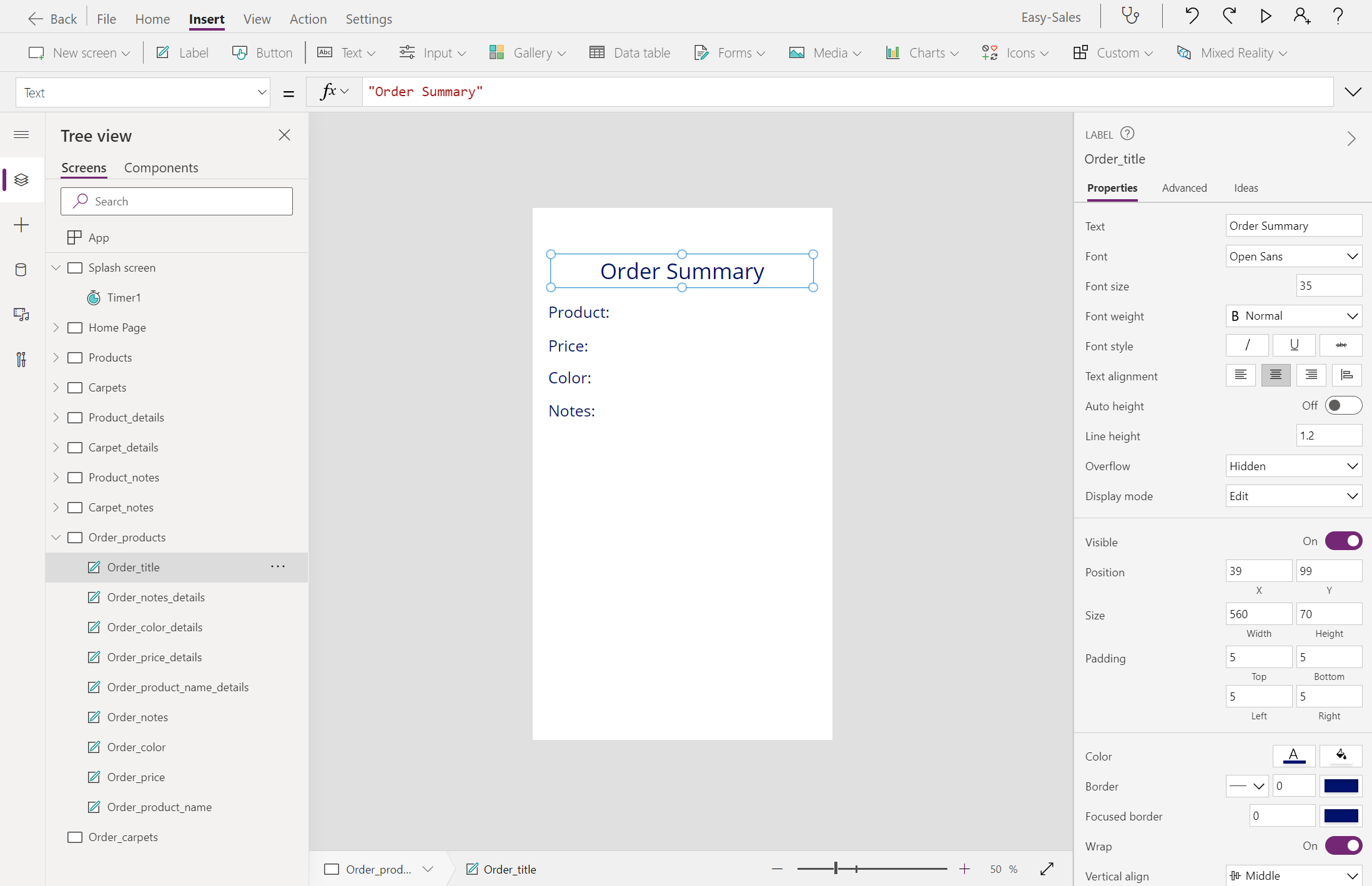 In the Order_products page, insert Product, Price, Color, and Notes labels and rename them accordingly.