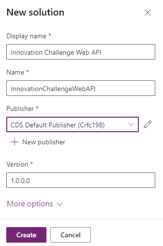 Enter Innovation Challenge Web API for Display name, select CDS default publisher for Publisher, and select Create.