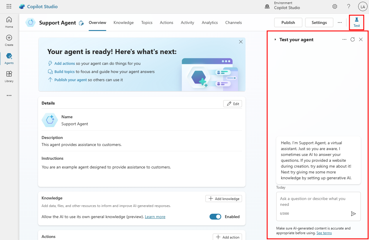 You can test your agent in real time by using the test agent panel, which you can enable by selecting Test in the upper right-hand side of the application. To hide the test pane, select the Test button again.